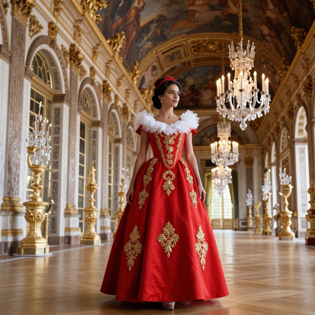 Elegant woman in a vibrant red gown with gold embellishments and white ruffled collar stands gracefully in the opulent halls of Versailles, surrounded by ornate chandeliers, golden arches, and classical paintings.