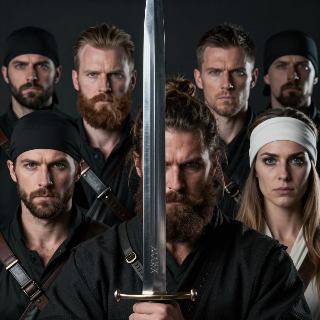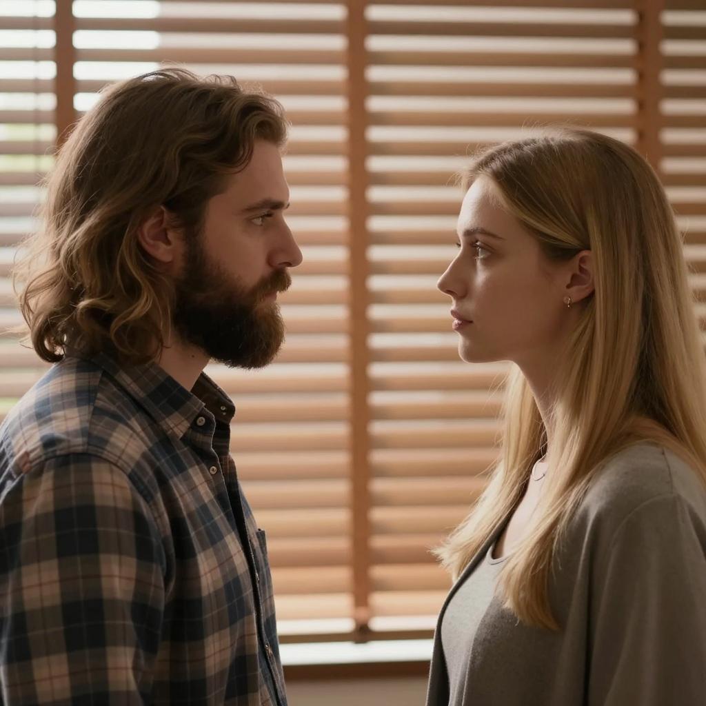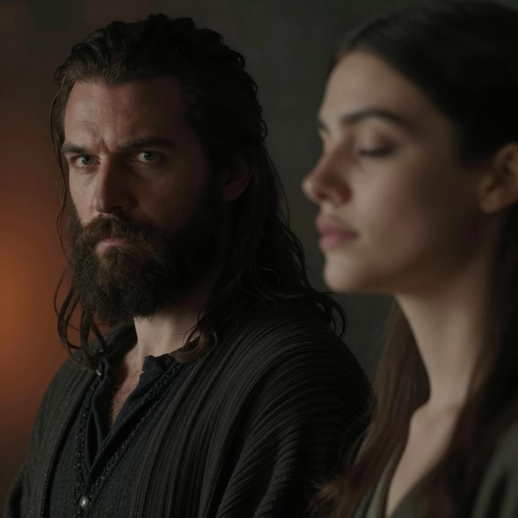 A dimly lit photograph of a bearded man with long dark hair, wearing a dark, ribbed, ured garment. To his right, a superimposed close-up of a serene woman with fair skin and dark hair, eyes closed. Orange and green hues in the background. Man's face partially shadowed, intense expression. Two people.