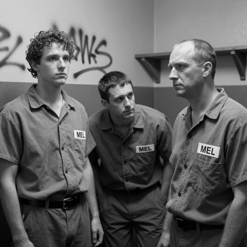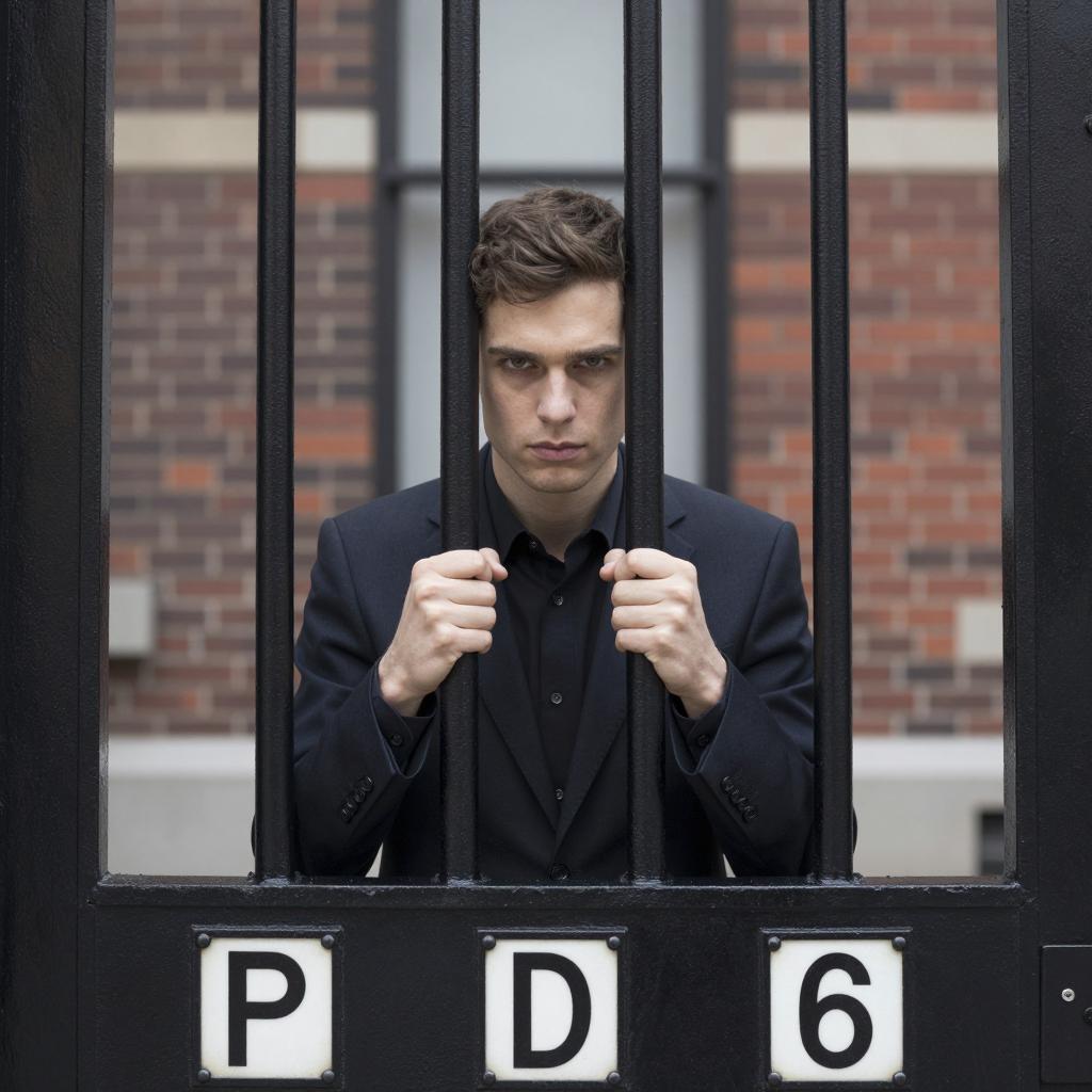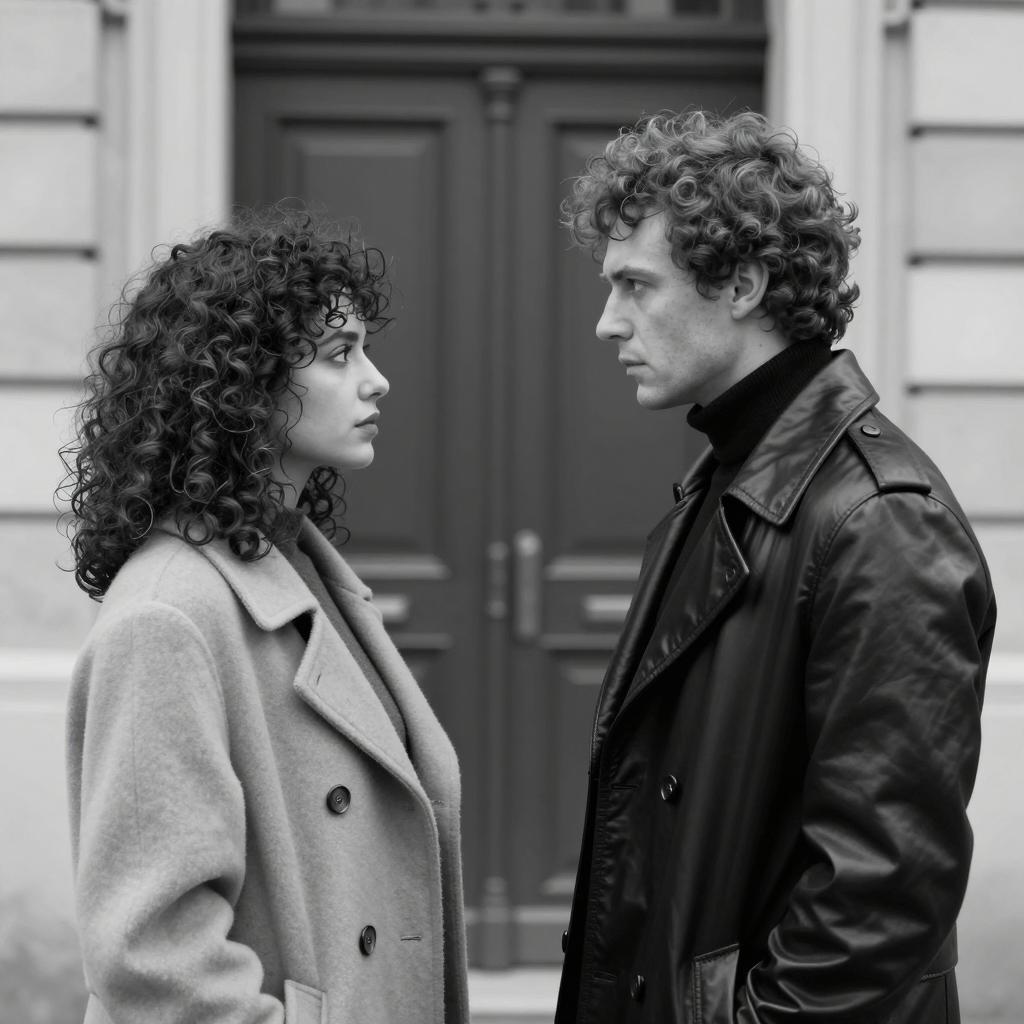 Two people behind black metal bars. Woman with dark red hair, bangs, wearing a dark blue and black top, holding bars with left hand. Man with curly brown hair, wearing a beige shirt, holding bars with right hand. Both look forward with serious expressions. Background is blurred beige. Man on right slightly closer to bars. Both hands gripping bars.