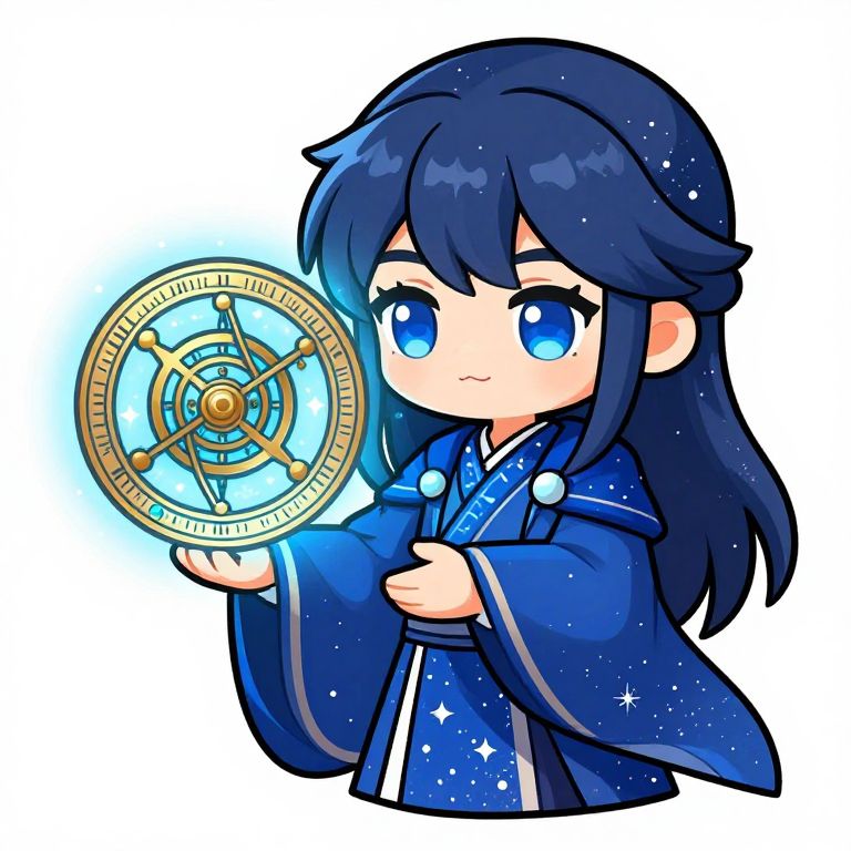 A highly detailed astrologian in starry blue attire, holding a celestial glowing orrery with runic patterns and starry particles, depicted in a crisp, chibi anime style with black contour lines, smooth gradients, and ultra-detailed, vivid colors.