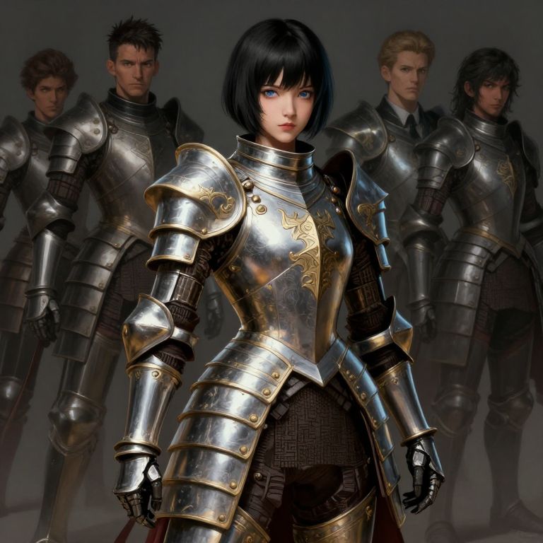This digital artwork depicts a fierce, fair-skinned woman with black bob-cut hair, standing in the foreground in detailed, reflective silver armor with gold accents. She has striking blue eyes and a serious expression. Behind her, four other armored men with varied hair colors and styles stand in a semi-circle, each with distinct facial features and expressions. The background is a dark, gradient gray, emphasizing the metallic sheen of their armor. The woman's armor is intricately designed, with visible patterns and a textured black underlayer. The men's armor is similarly detailed, showcasing a mix of short and long hair, and they all have muscular builds. The overall style is realistic with a slight fantasy element.