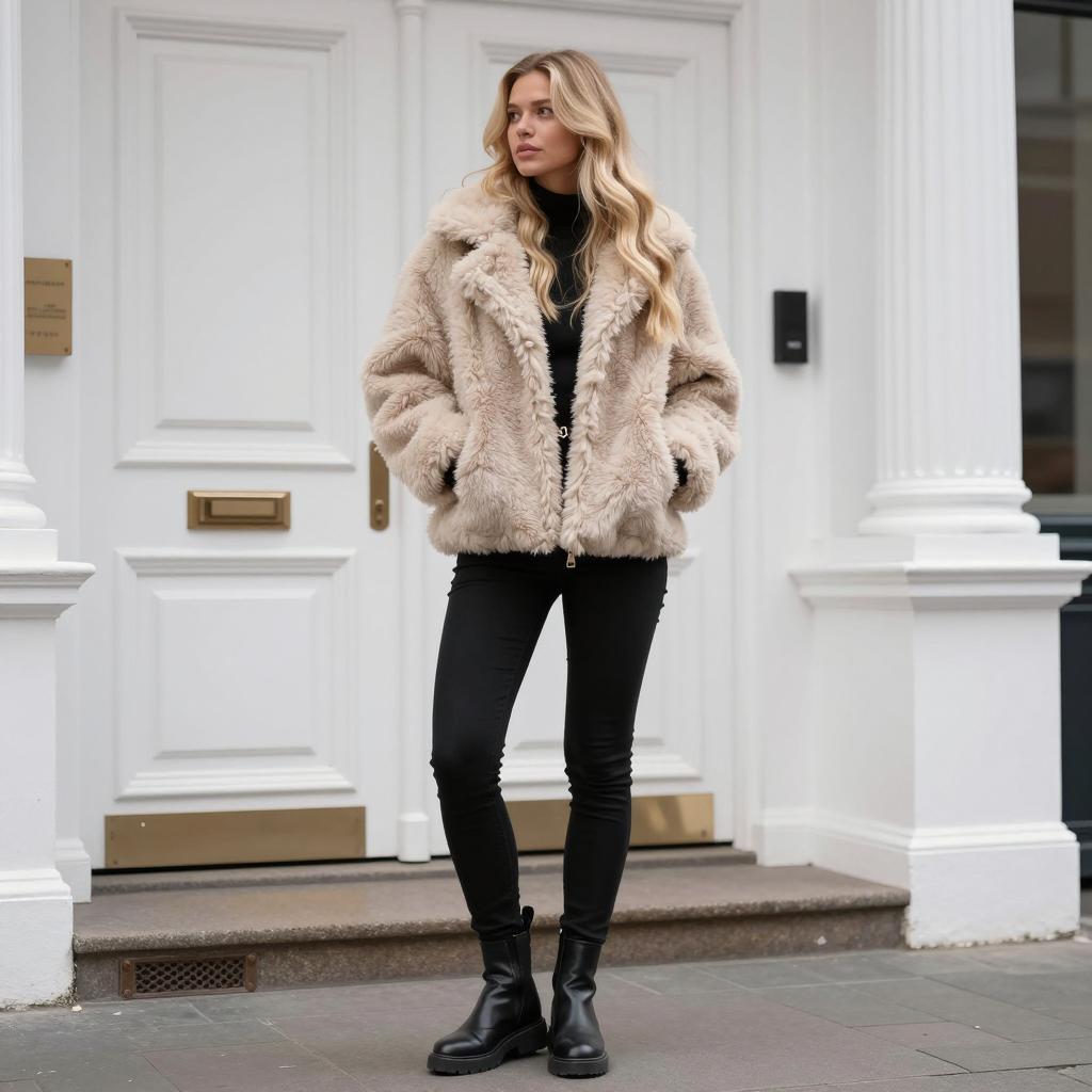Woman squatting, white fur coat, hood up, hiding face. White fishnet tights, white high heels. Concrete wall background. Brown hair visible. Intense, slightly sad facial expression. Full-length, street-style photograph.