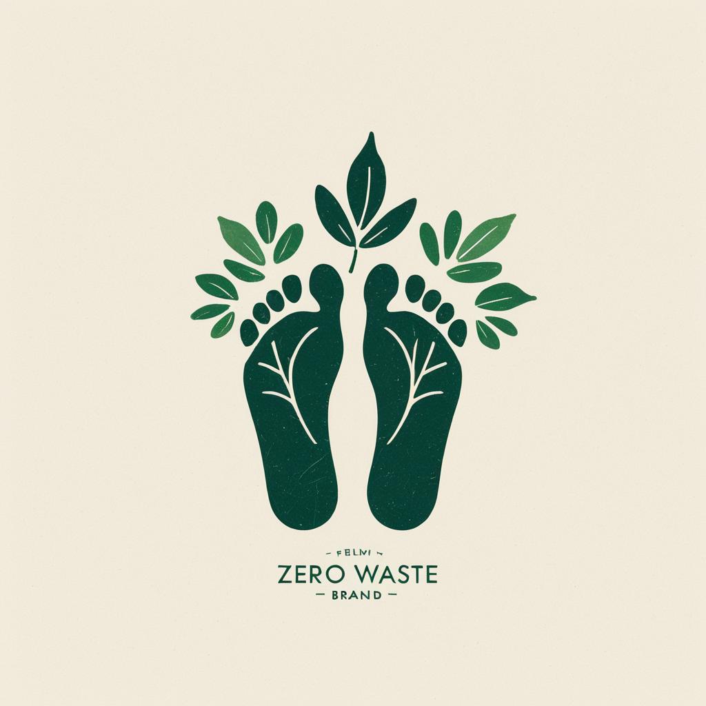 Minimalist logo design featuring a pair of dark green footprints with leaf veins, surrounded by small green leaves. The design represents a brand committed to a zero waste lifestyle and sustainability, using clean lines and soft green tones against a light beige background. The text below reads 'Zero Waste Brand', emphasizing environmental consciousness.