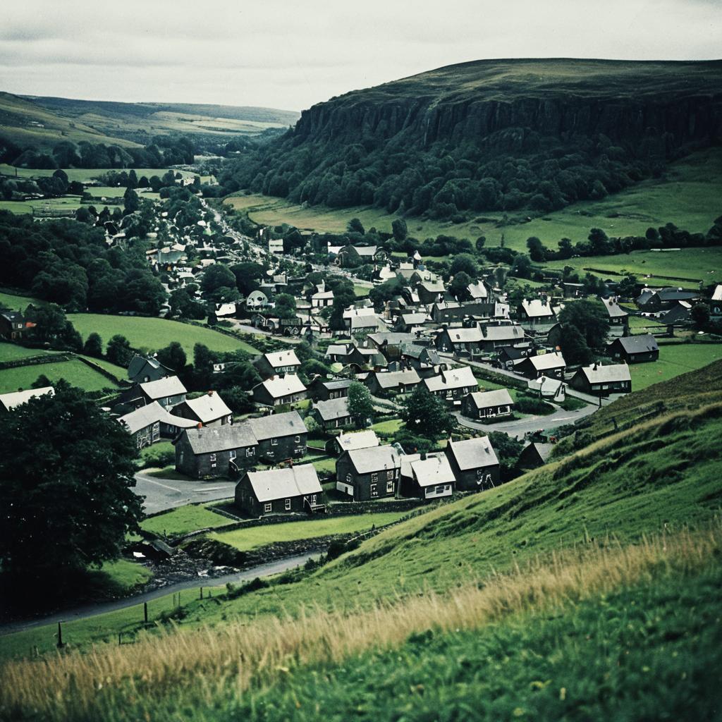 A scenic landscape of a small, idyllic town nestled beside a calm river with lush greenery and rolling hills in the background under a partly cloudy sky. Traditional houses are scattered throughout the town, surrounded by open fields and dense trees, creating a peaceful rural atmosphere.