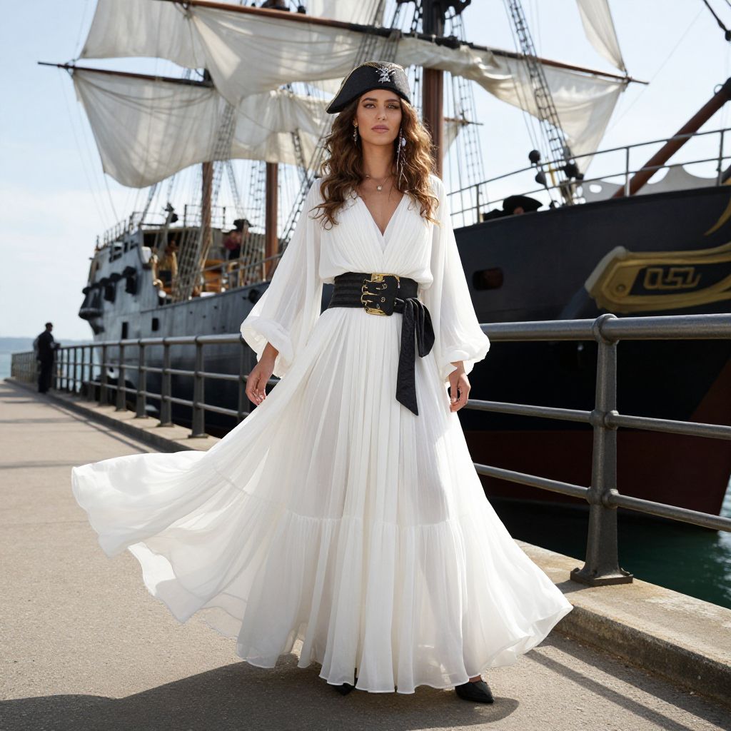 White Flowy Pirate Dress, woman in white dress standing on a bridge with a ship in the background