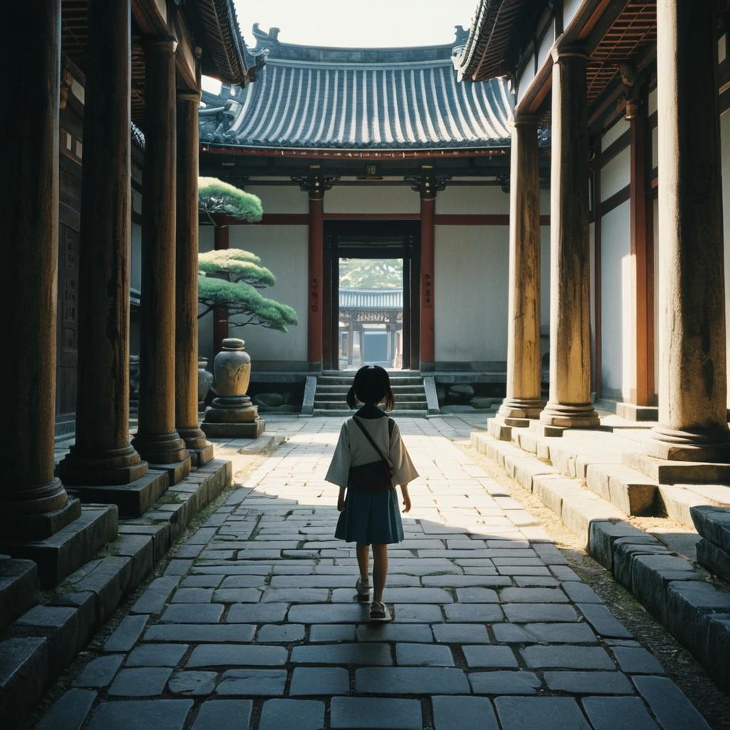 A person wearing a brown coat walking along a tiled pathway in a park during autumn. The scene is surrounded by trees with golden-yellow leaves and green bushes. The soft sunlight creates long shadows on the ground, enhancing the peaceful autumn atmosphere.