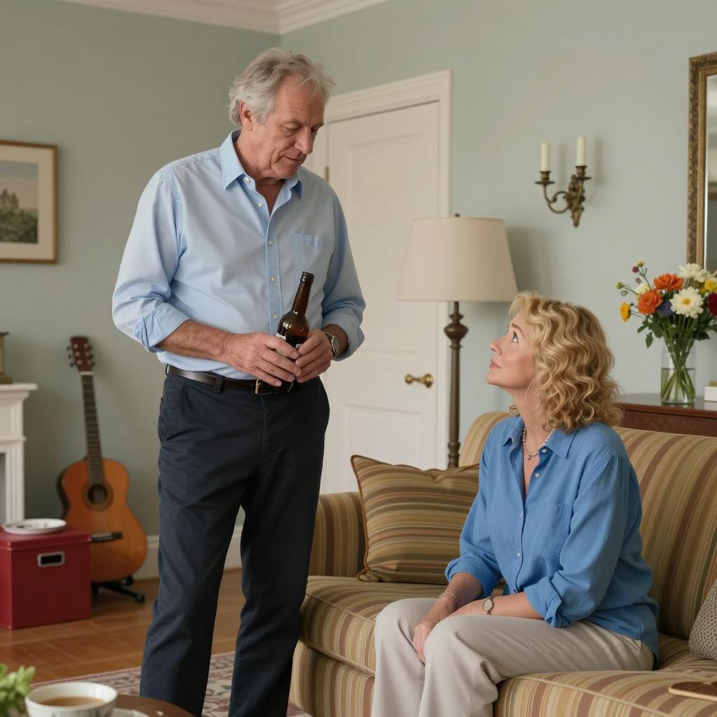 Mid-20th century bar scene photograph. Middle-aged man with gray hair, brown jacket, and white shirt sits left, smiling at blonde woman with wavy hair, beige scarf, and brown jacket on right. Two glasses of water on table. Background: dimly lit bar with purple neon lights, several people standing and talking. Man faces right, woman faces left.