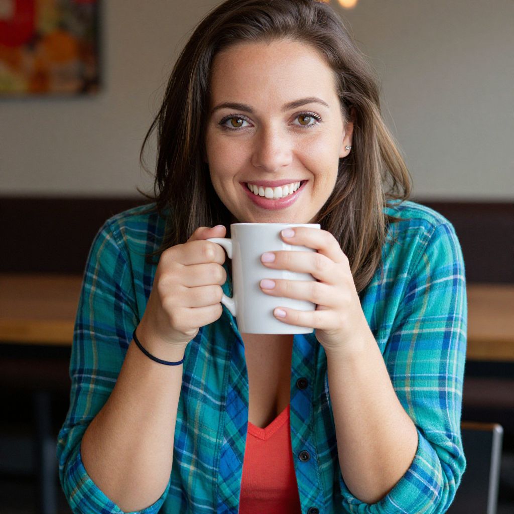 A photograph of a smiling woman with shoulder-length brown hair, wearing a green and blue plaid shirt over a red top. She's holding a white mug close to her face with both hands, sitting at a table. She has a black hair tie on her right wrist and a blue bracelet on her left. The background is blurred, suggesting an indoor setting.