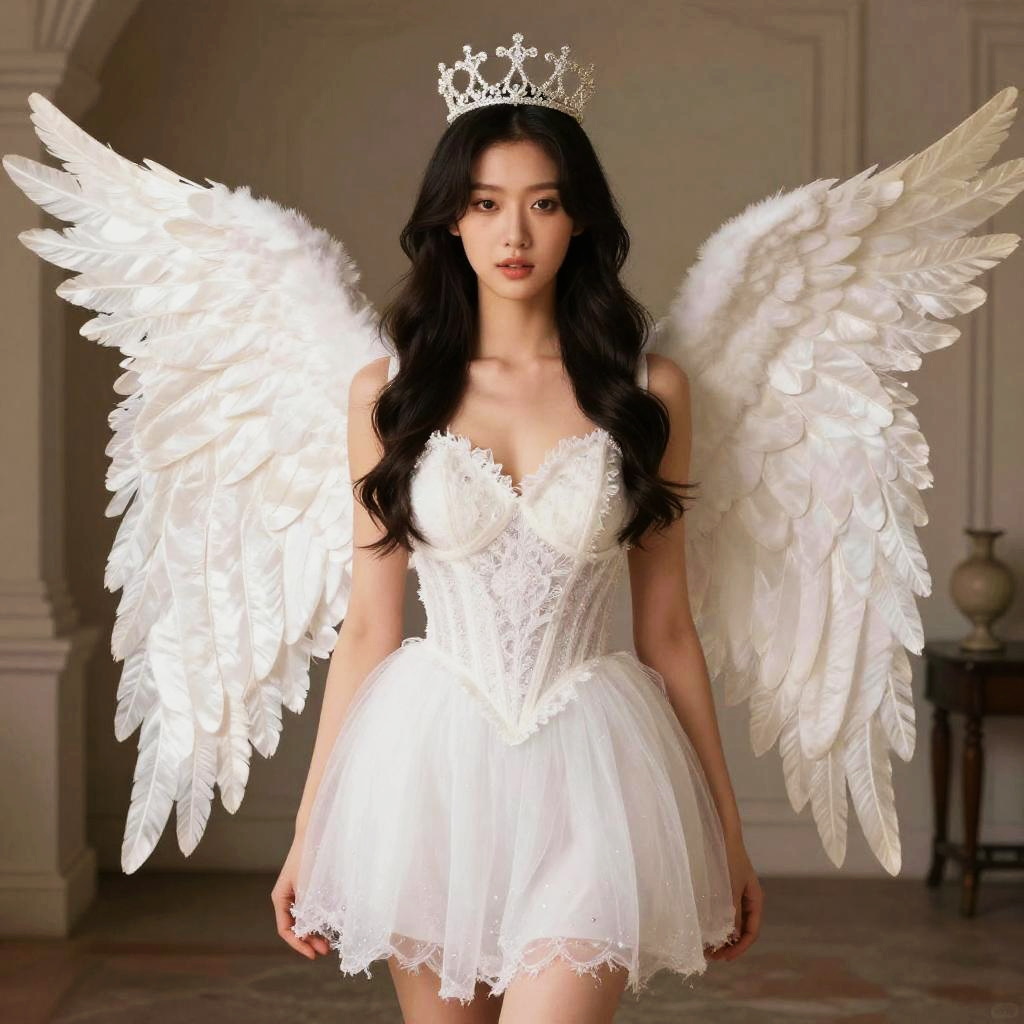 Young Asian woman dressed in an angel costume featuring large white feathered wings and a white lace dress embroidered with delicate patterns. She wears a silver crown adorned with purple jewels, standing against a plain gray background. The angelic outfit and serene expression suggest a fantasy or themed party setting.