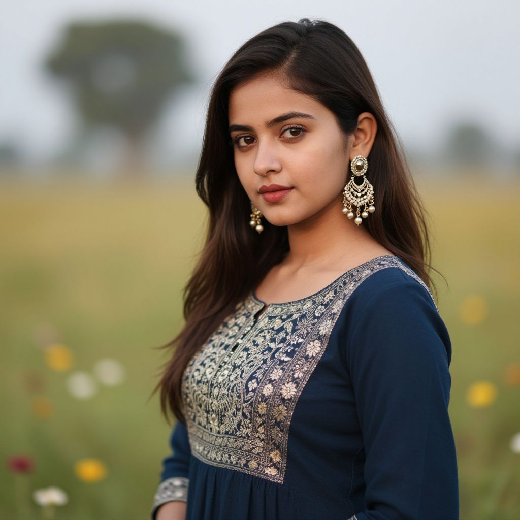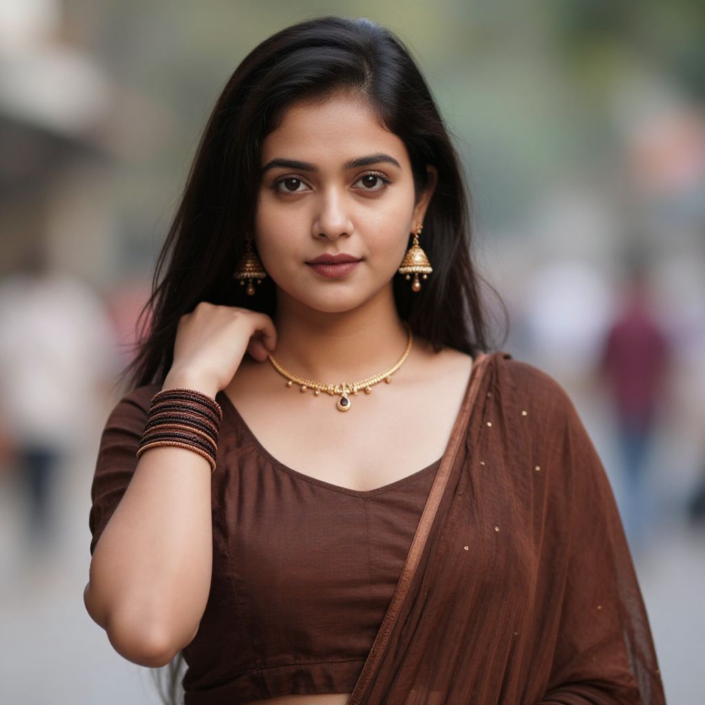 "full anarkali dress, 1girl, solo, long hair, dress, flower, freckles, outdoors, blurry, blurry background, looking at viewer, brown hair, smile, black hair, standing, sleeveless, floral print Realistic photo of casual sexy person with pretty face"