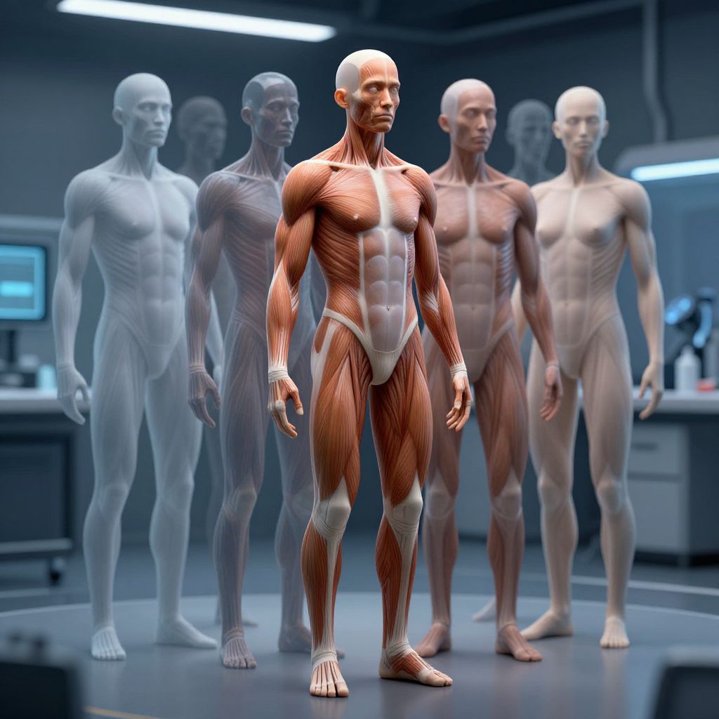 A digital CGI image depicting five anatomically detailed, muscular male human figures in a futuristic laboratory. The central figure is fully colored, showcasing prominent muscle definition with red and white skin tones, while the four background figures are semi-transparent, highlighting their skeletal and muscle structures. They stand on a circular platform under bright fluorescent lights, with blurred laboratory equipment visible in the background. The central figure's facial expression is neutral, and he wears a minimalistic white loincloth. The overall style is highly realistic and scientific, focusing on human anatomy.