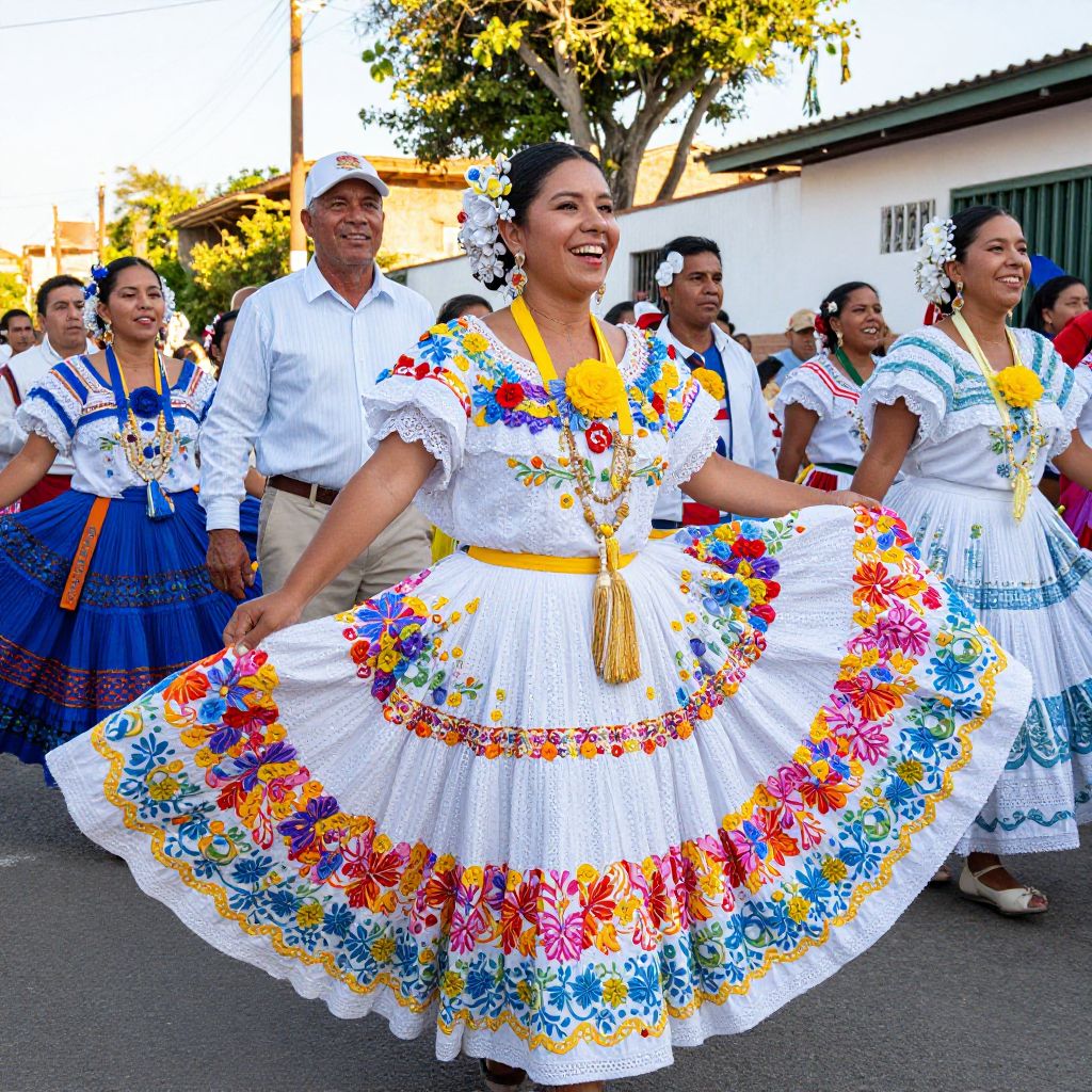 Photograph of a vibrant Mexican dance group in colorful traditional dresses and white shirts, with floral embroidery, smiling and dancing outdoors.