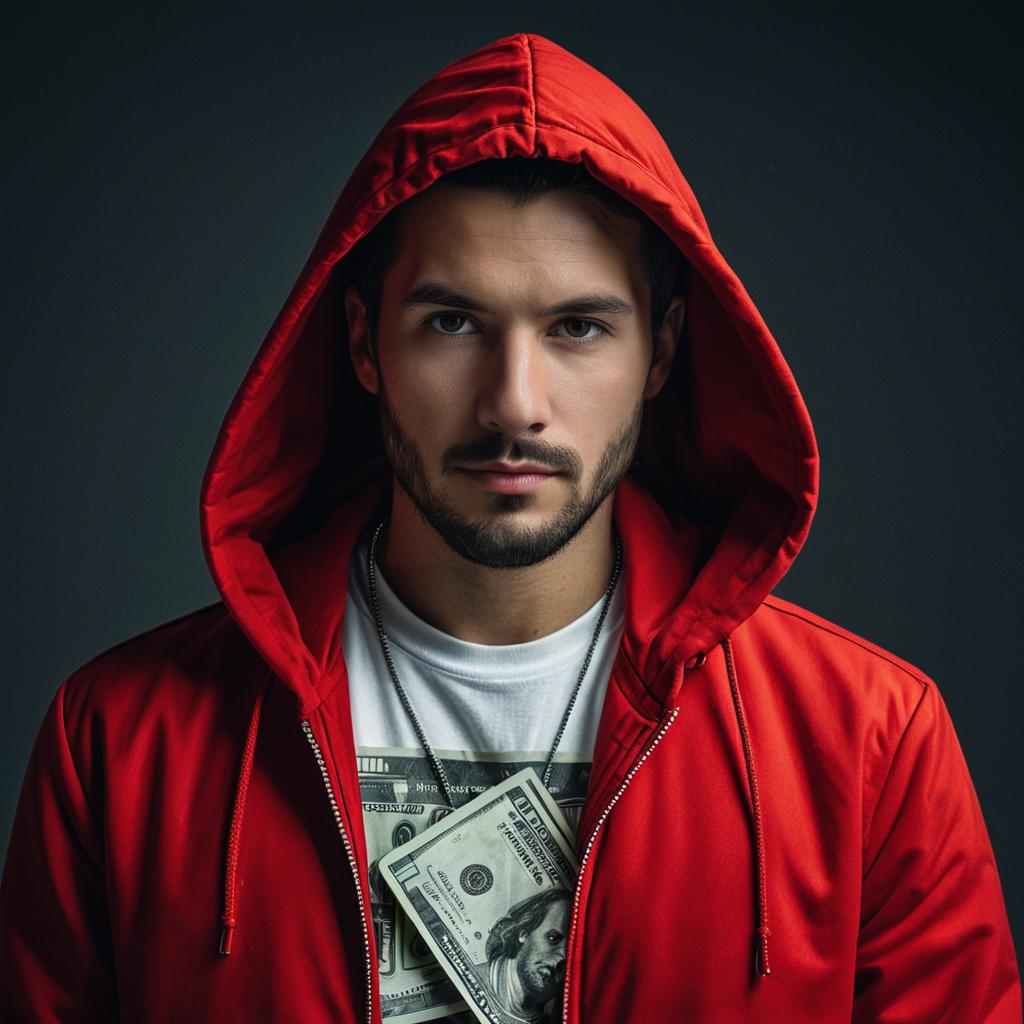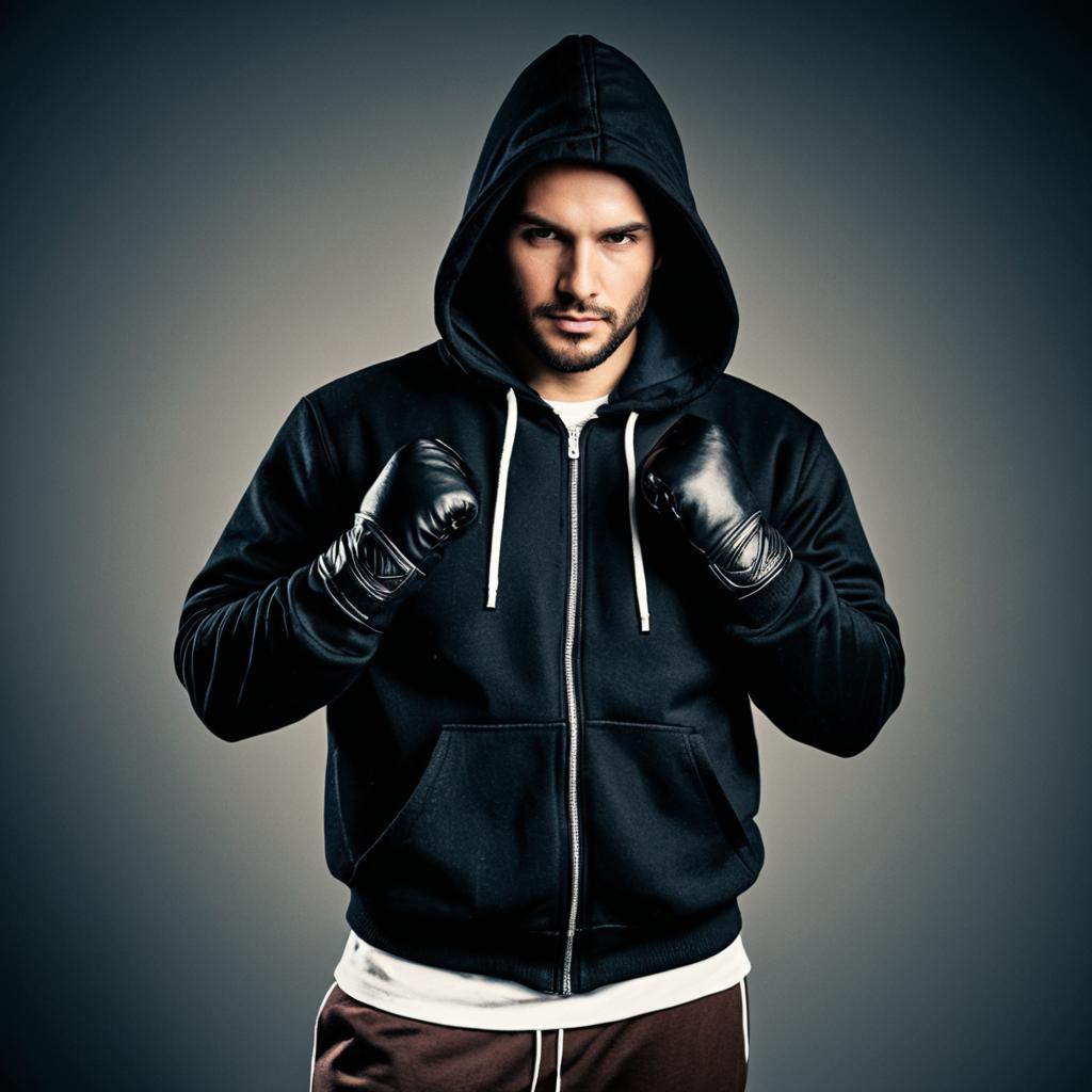 Adult guy costume,1boy, male focus, solo, gloves, facial hair, hood, realistic, hoodie, brown hair, looking at viewer, pants, closed mouth, black gloves