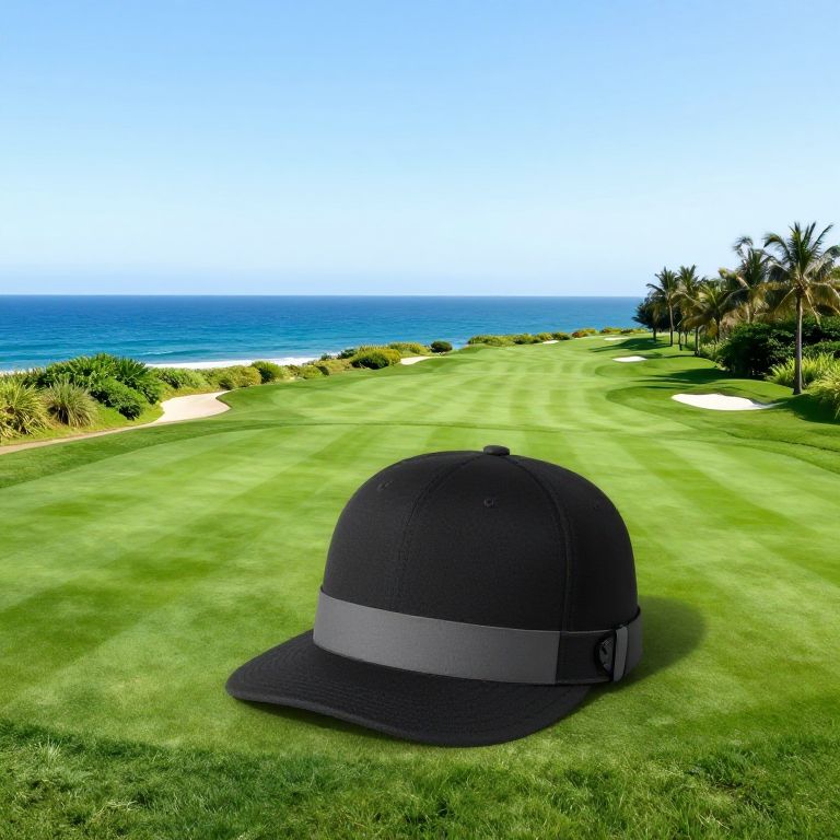 Photograph of a black baseball cap with a gray band, placed on a well-maintained green golf course overlooking a clear blue ocean and palm trees