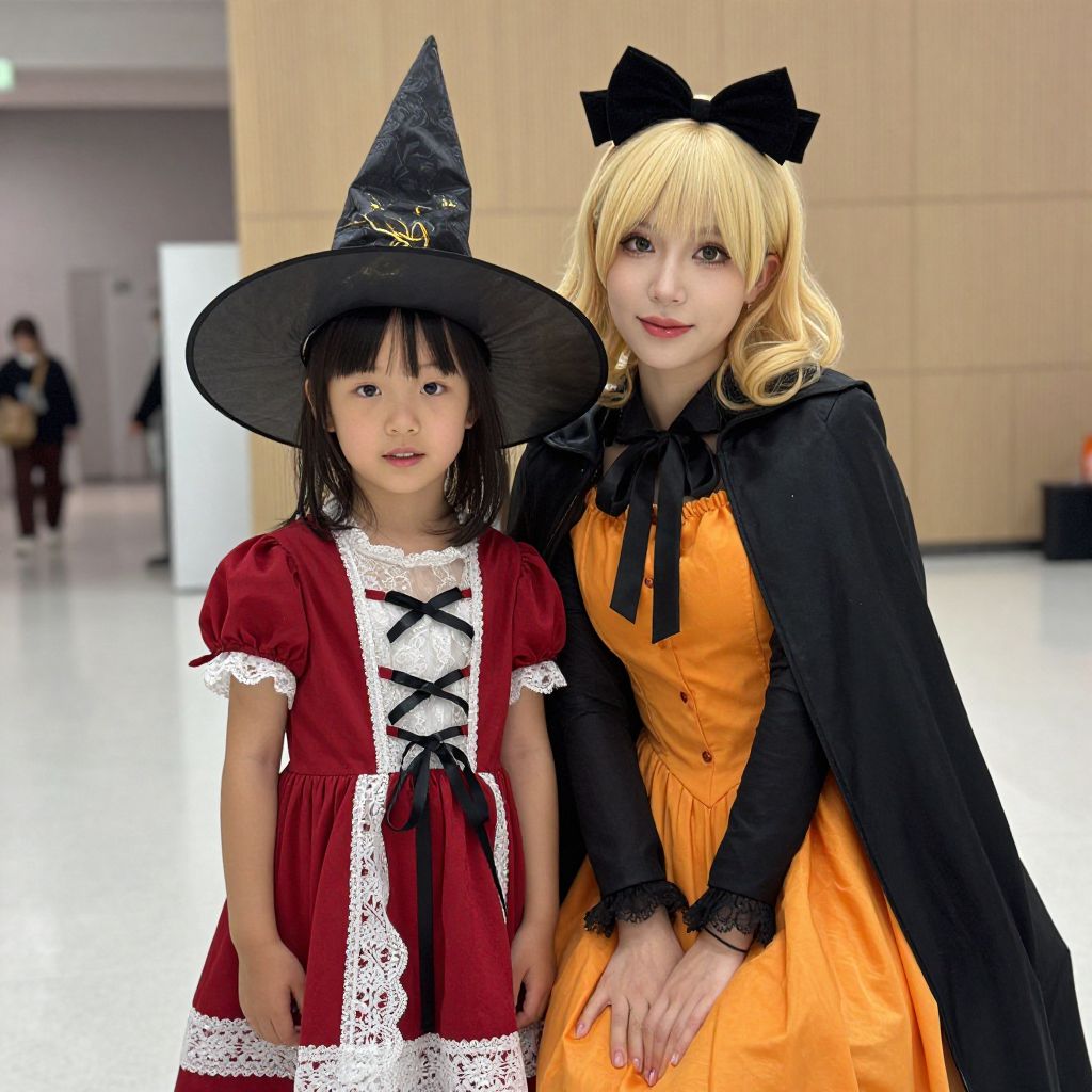 Photograph of an Asian woman and young girl in a brightly lit indoor setting, both dressed in Halloween costumes. The woman has blonde hair, fair skin, and wears a black witch hat with a large black bow, an orange dress with black lace trim, and a black cape. She has a gentle smile and stands slightly behind the girl. The girl, with black hair and fair skin, wears a red dress with white lace trim and black crisscrossing ribbons, also with a black witch hat. The background features a beige wall and blurred figures. The image has a vivid, slightly over-saturated color style.