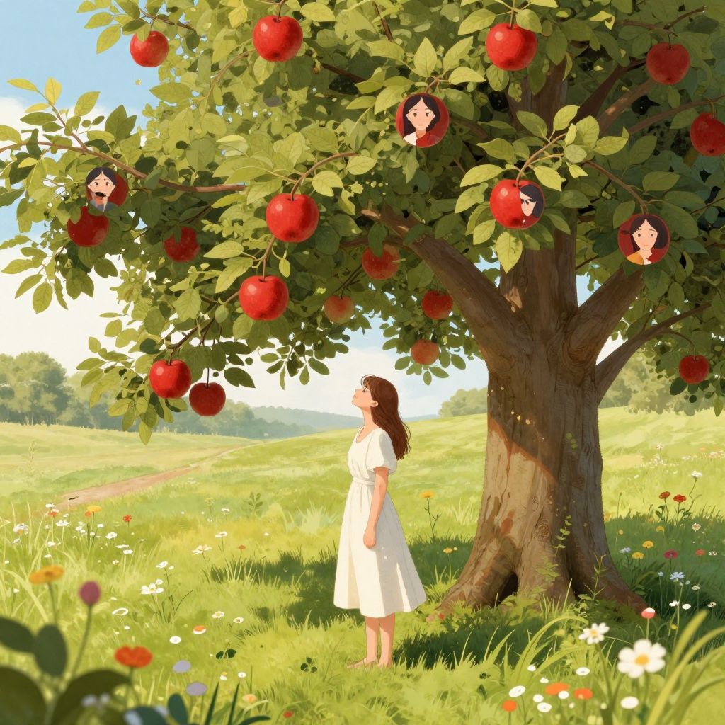 A vibrant digital illustration depicts a young woman standing beneath a lush, oversized apple tree adorned with red fruits, symbolizing a whimsical, surreal vision where each fruit reflects fragments of her future selves, as she gazes upward in contemplation amidst a serene, sunlit meadow dotted with wildflowers.