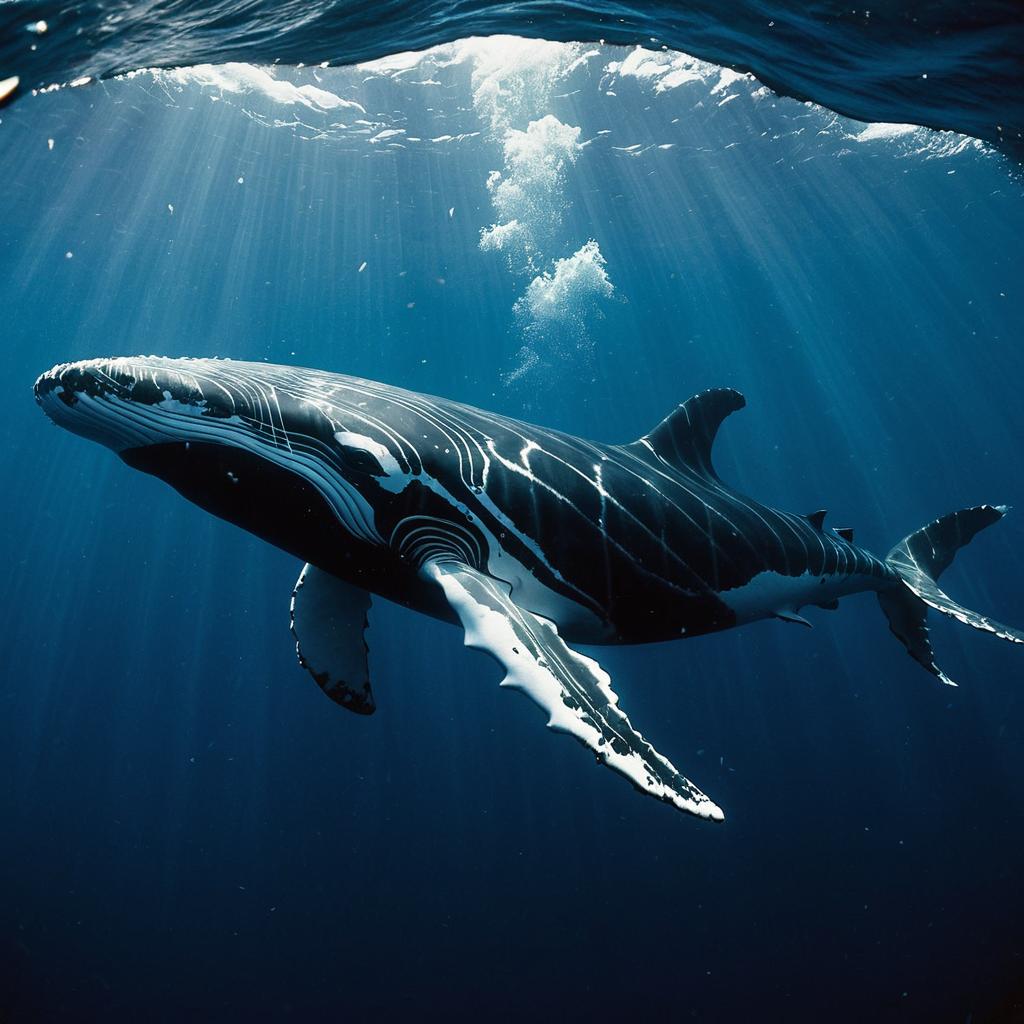 Ice painting of glacier whale in an icy ocean expanse, featuring intricate ice textures and glacial details in a magical atmosphere.