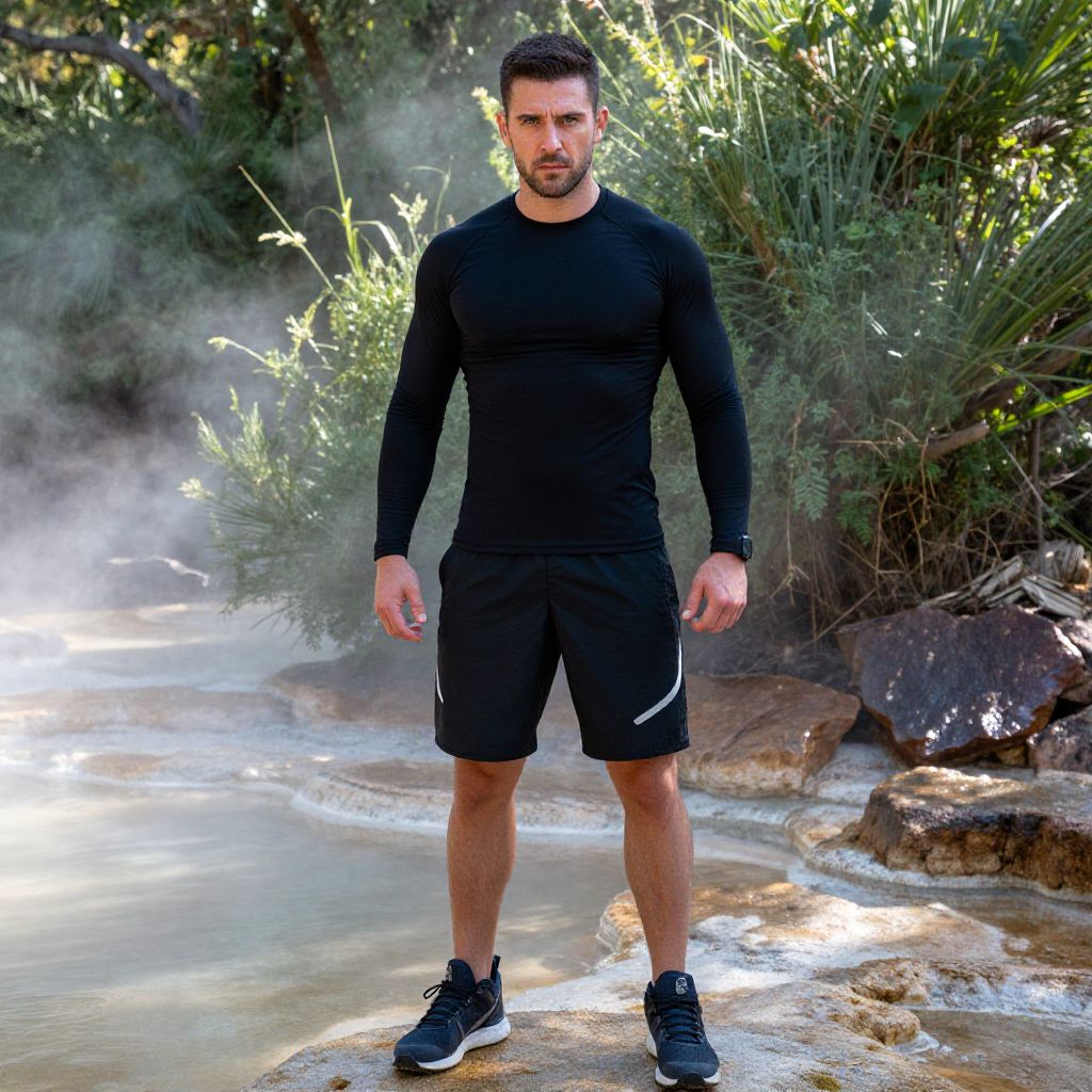 A man, fitted long-sleeve compression top, black stretch shorts, reflective accents, high-performance sneakers, steam rising from mineral-rich pools, lush green foliage surrounding, rocky outcrops glistening in sunlight, chromogenic film style, focused expression, determination in his eyes. Man has masculine face and piercing eyes