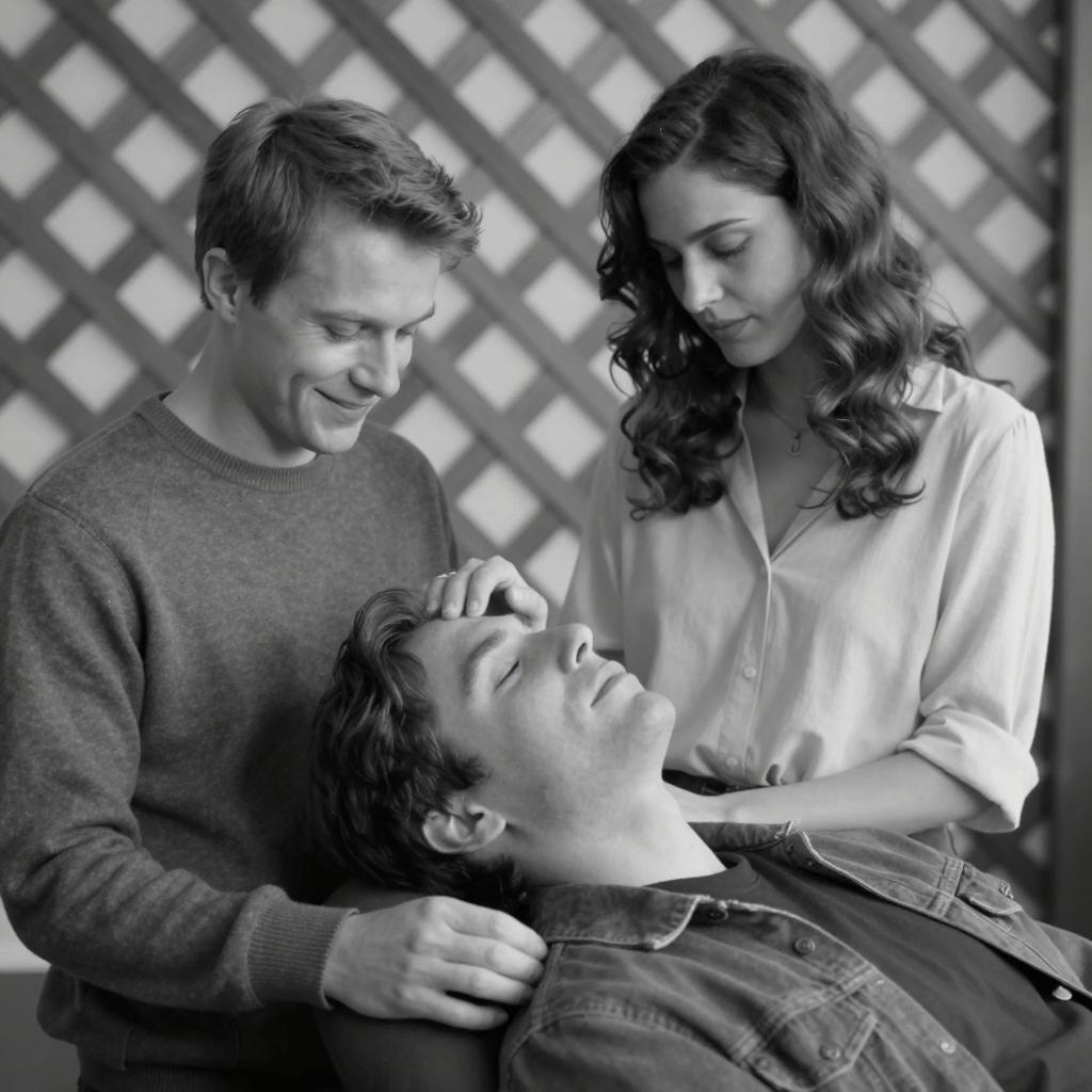 Close-up of a young man with disheveled hair and bruised face wearing a dark shirt facing a young woman with dark hair tied in a ponytail wearing a dark top. The woman has her hands on the man’s shoulders and both have intense expressions. The background features a gray wall and a decorative window grille.