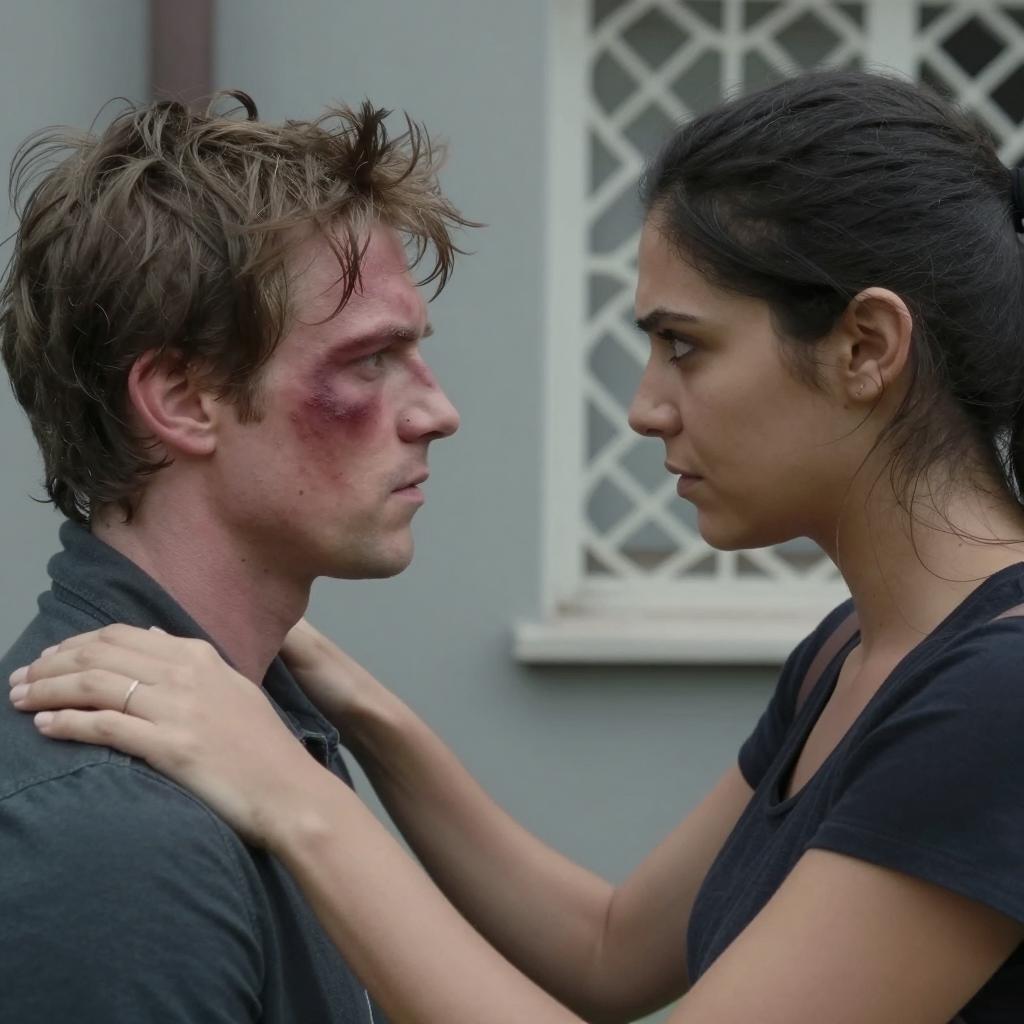 A close-up scene with two people. A man with disheveled hair and bruised face, wearing a dark shirt, faces a woman with dark hair in a ponytail, wearing a dark top. They are leaning towards each other, with the woman's hand on the man's shoulder. Background includes a gray wall and a decorative window grille. The woman's expression is intense, while the man's expression is neutral. Two people.