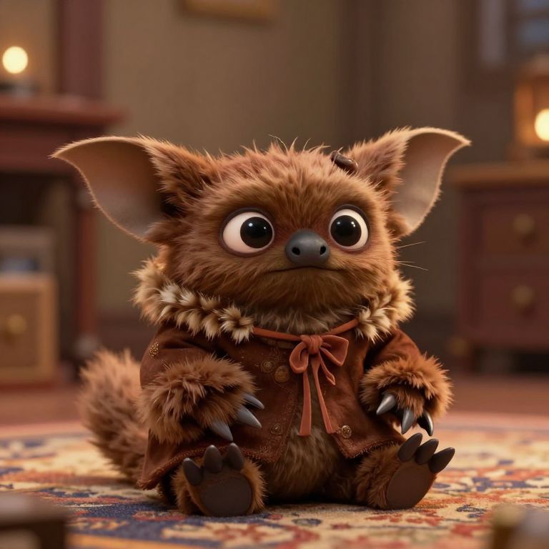 Photorealistic digital artwork of an adorable, small, brown, furry creature with large, round, black eyes, and oversized ears. It wears a brown, fur-trimmed jacket with a red ribbon tied at the neck. The creature has sharp, black claws on its paws and sits on a patterned rug in a warmly lit, cozy room with wooden furniture in the blurred background. The lighting highlights the creature's soft fur texture and expressive eyes, creating a cute and endearing atmosphere.