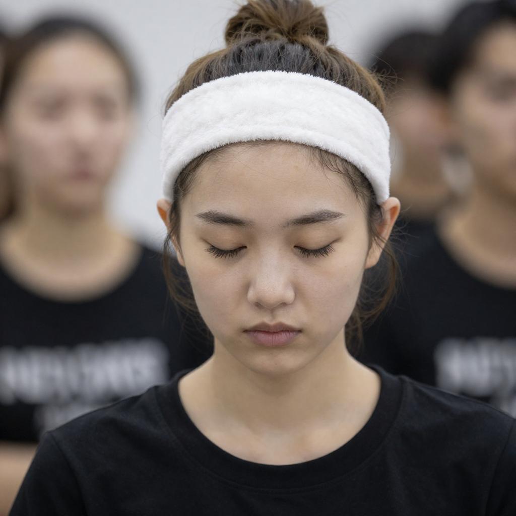 Close-up photo of a young Asian woman with light skin and brown hair tied in a loose bun, wearing a white terry cloth headband and a black top. She has her eyes closed and looks downward with a calm, pensive expression. The blurred background shows other individuals also dressed in black, suggesting a group meditation or mindfulness session.