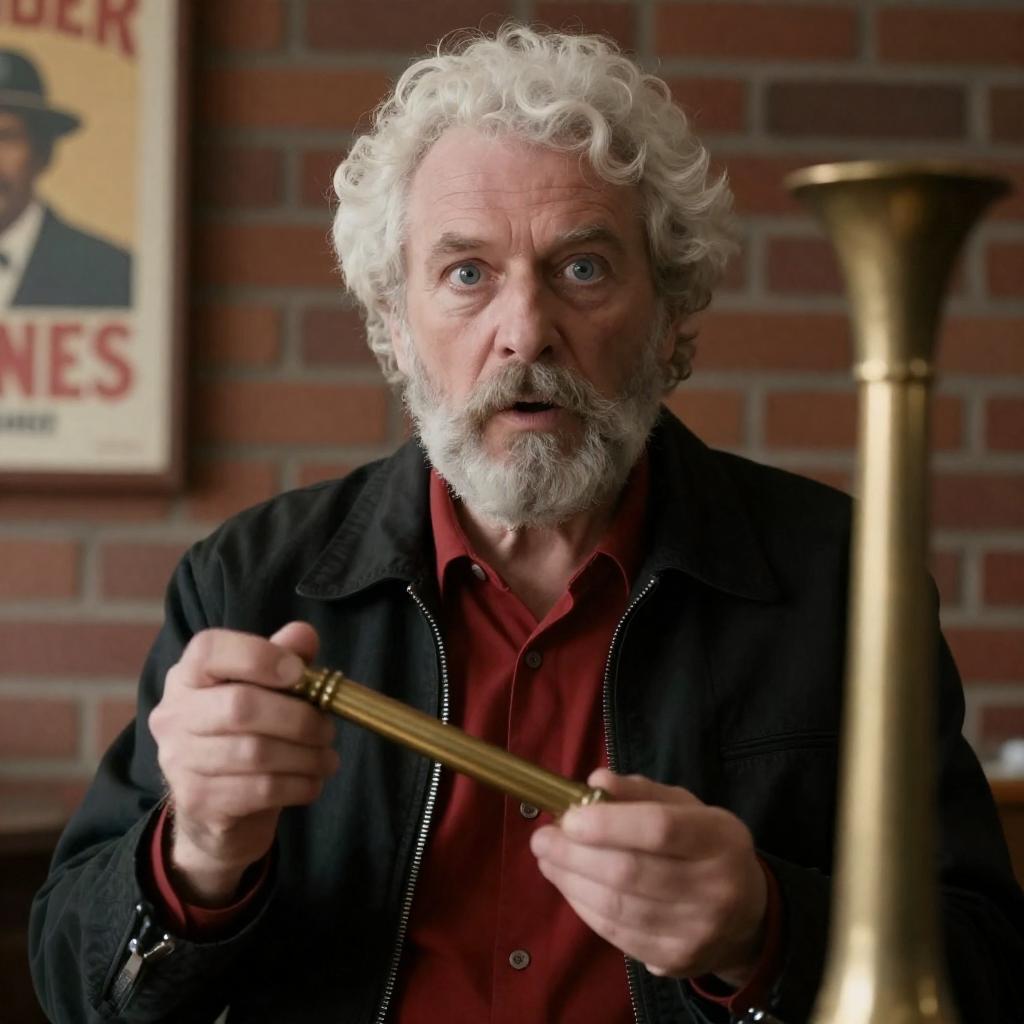 Old man with white beard, wearing brown vest and beige shirt, points white revolver at camera. Intense expression. Background: British flag, dark room, wooden furniture, skull ornament. Room lit from front. One person. Action pose.
