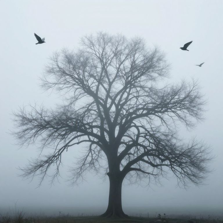 Silent, spectral birds hover weightlessly amidst the skeletal branches of a solitary, ethereal tree, its form emerging from the mist like a shadow cast by the unseen.