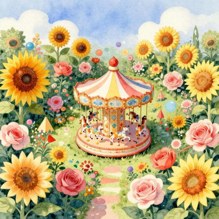 Craft an impressionistic watercolor scene from a surreal aerial perspective, resembling a bug's-eye view. The landscape is characterized by a lush garden teeming with oversized flowers in a palette of vibrant hues, including radiant sunflowers and delicate roses, intricately woven with abstract geometric shapes like circles and triangles. At the heart of this dreamlike setting stands a whimsical carousel, its painted animals rotating slowly against the sky, evoking a sense of wonder and nostalgia while capturing an emotional spectrum ranging from playful innocence to serene contemplation.