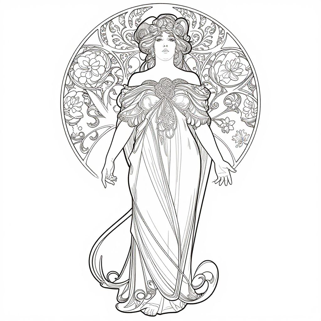 Alphonse Mucha coloring pages highlighting the elegance of early 20th century Art Nouveau style with detailed patterns, romantic female portraits, and flowing organic shapes that provide a sophisticated coloring challenge.