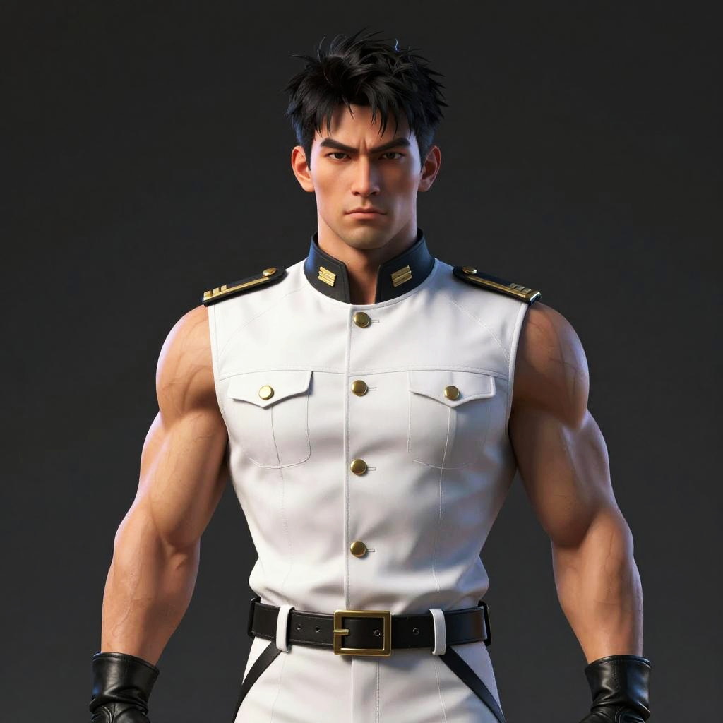 A 3D-rendered image of a muscular, attractive man with short, messy black hair and a serious expression. He's wearing a sleeveless white uniform with black trim, gold buttons, and a black belt, along with black leather gloves. His well-defined abs and biceps are prominently displayed. The dark, gradient background makes him stand out. The overall style is dramatic and intense.