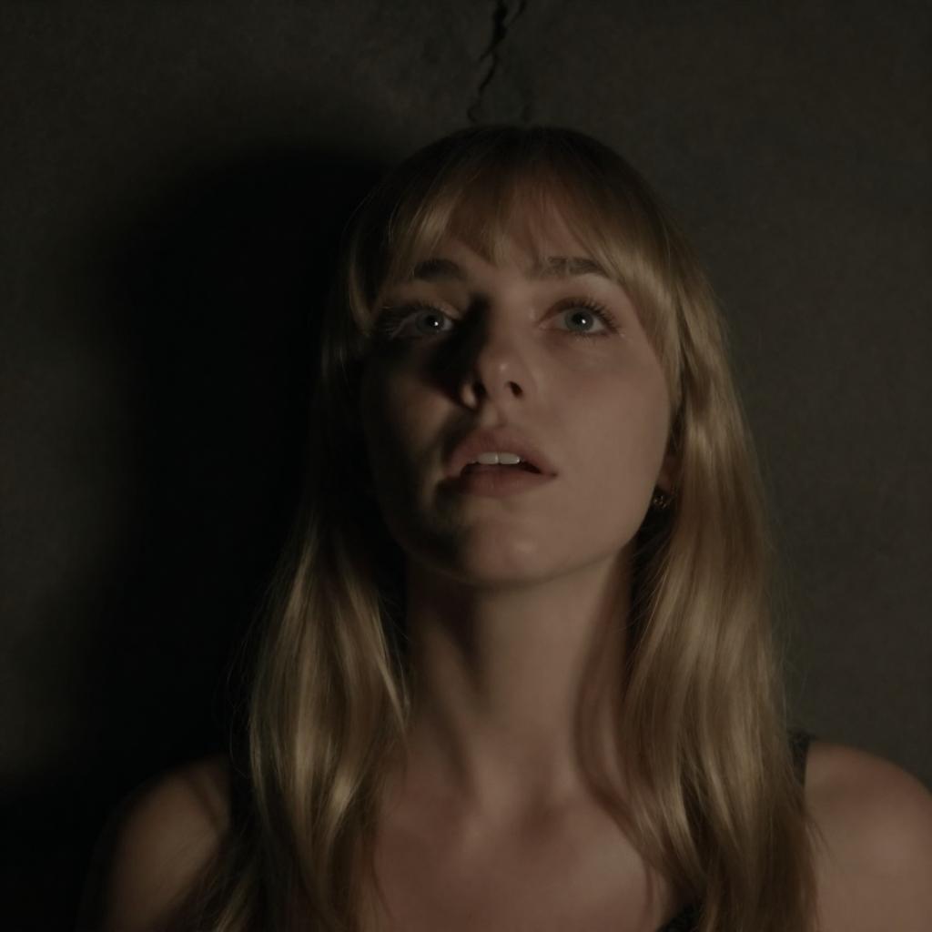 Black-and-white photograph of a young woman with short blonde hair, wearing a striped shirt and dark pants, kneeling on a rug in a dimly lit room. She holds her hands together, looking up with a surprised expression. Behind her is a wooden dresser and cabinet. A glowing light is on the floor in the foreground, and clothes are scattered nearby.
