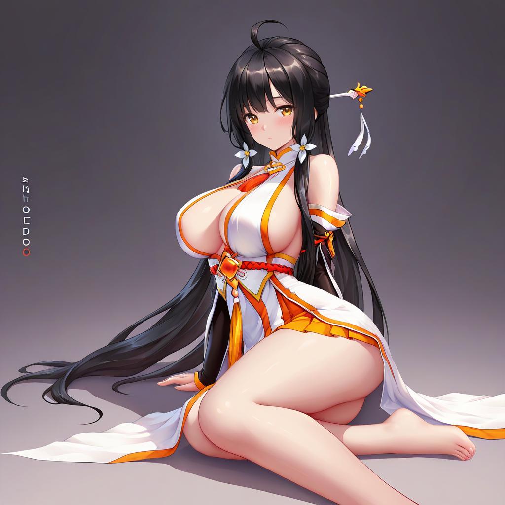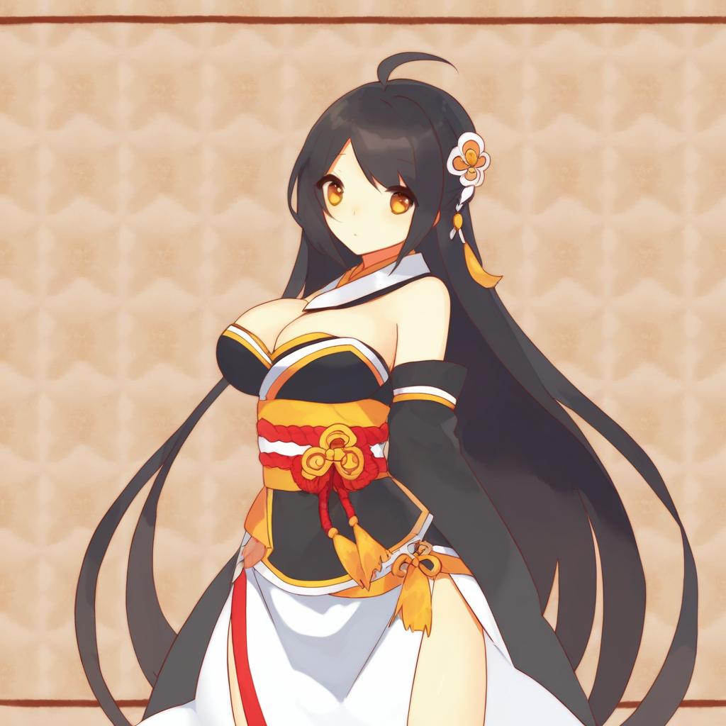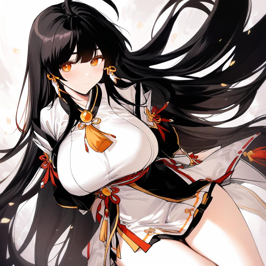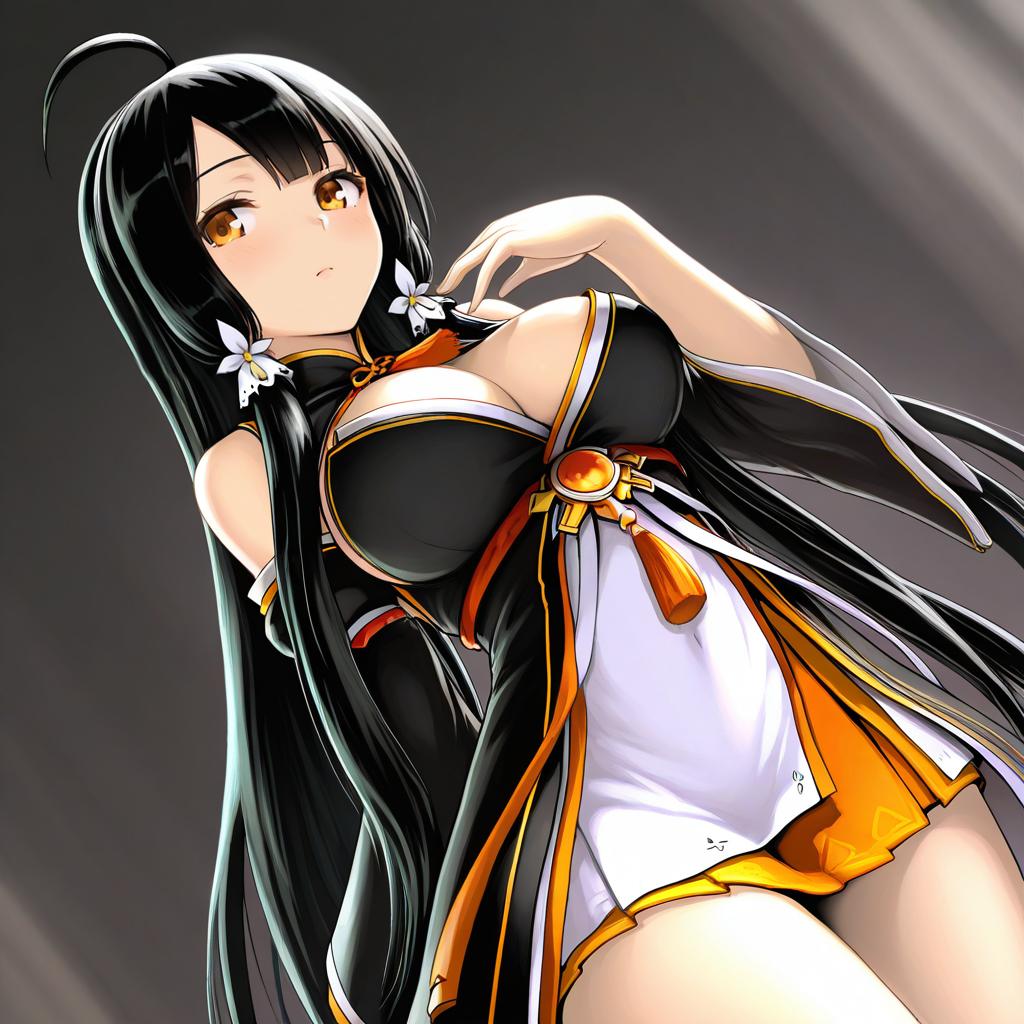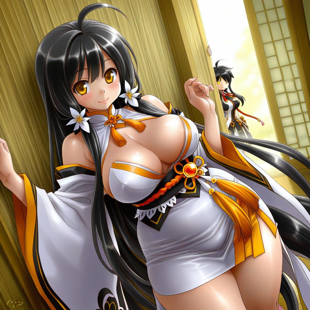 Ara haan, elsword, 1girl, yellow eyes, red eyes, black hair, long hair, very long hair, ahoge, large breasts, by artist nyororiso (muyaa), illustrious