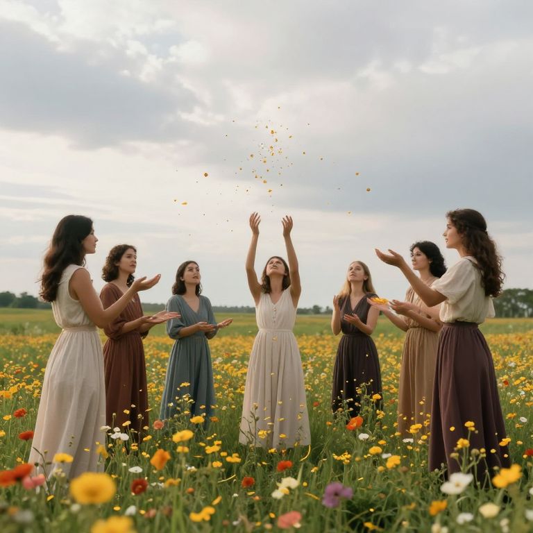 In a hushed meadow where vibrant blooms whisper secrets to the sky, a circle of individuals stands in silent communion, their raised hands releasing golden petals that dance like fleeting dreams, embodying the ephemeral beauty of connection and the transcendence of shared moments.