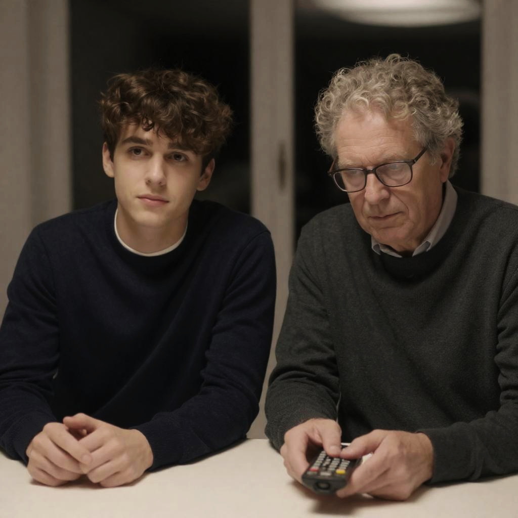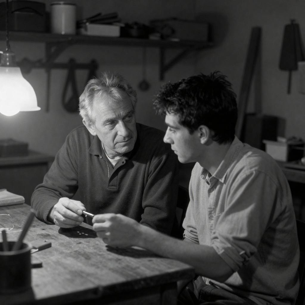 Black-and-white photograph of a young man with curly hair and intense expression facing an older man with a wrinkled face and hat. Young man wears light shirt, older man wears dark jacket. Background includes window with vertical bars. Young man on left, older man on right. Two people.
