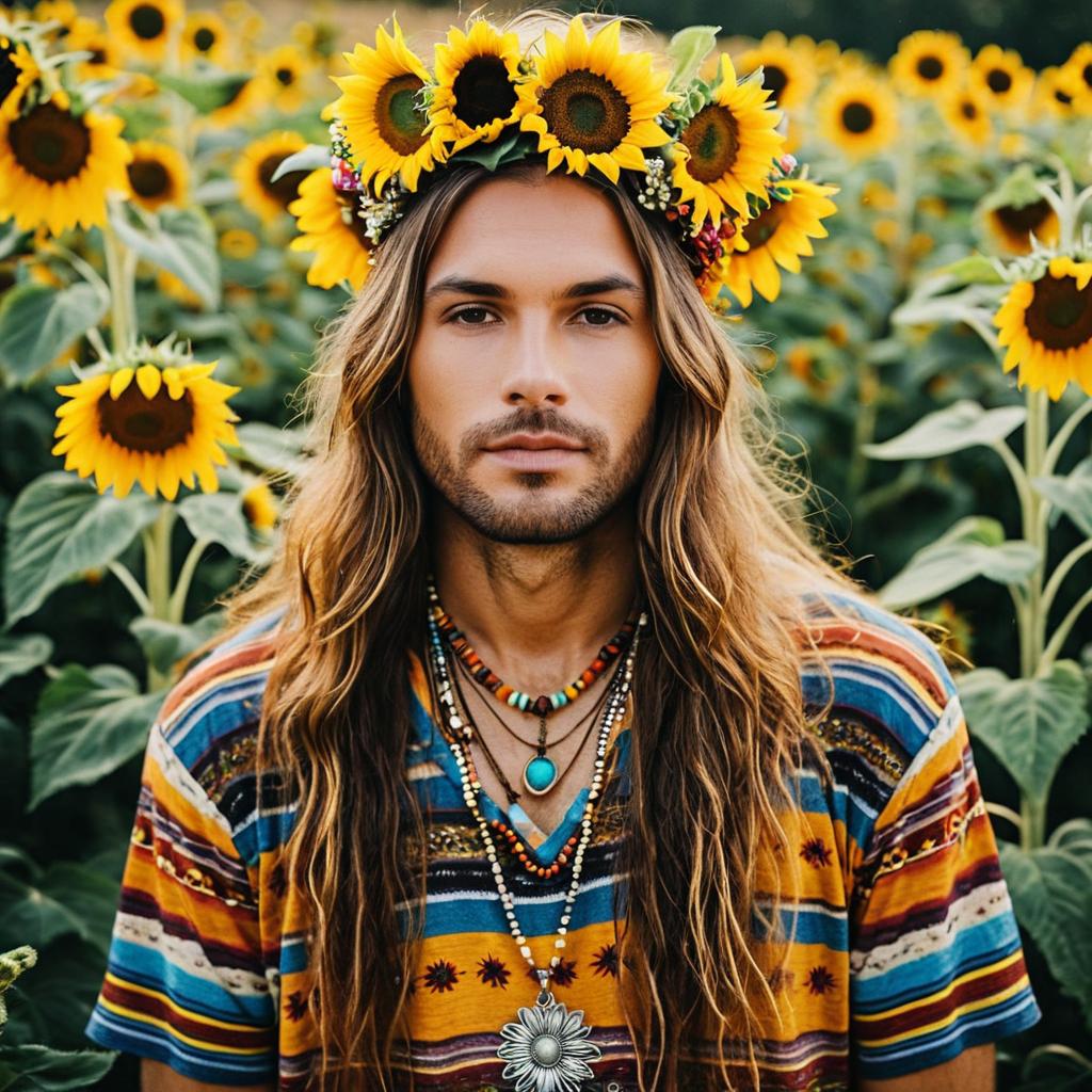 Male hippie, photorealistic portrait, long-haired man, hippie style, wearing flower crown, colorful striped shirt, layered necklaces, sunflowers and vibrant flowers in background, earthy tones, bohemian fashion, natural light, outdoors, serene expression, detailed ures, soft focus, warm colors, front view, upper body