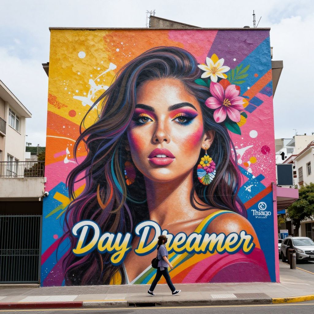 Vibrant mural titled \"Day Dreamer\" by Thiago Valdi adorns a city street, featuring a striking portrait of a woman with flowing hair, colorful makeup, and floral accents, set against a backdrop of urban buildings and a pedestrian walking below.