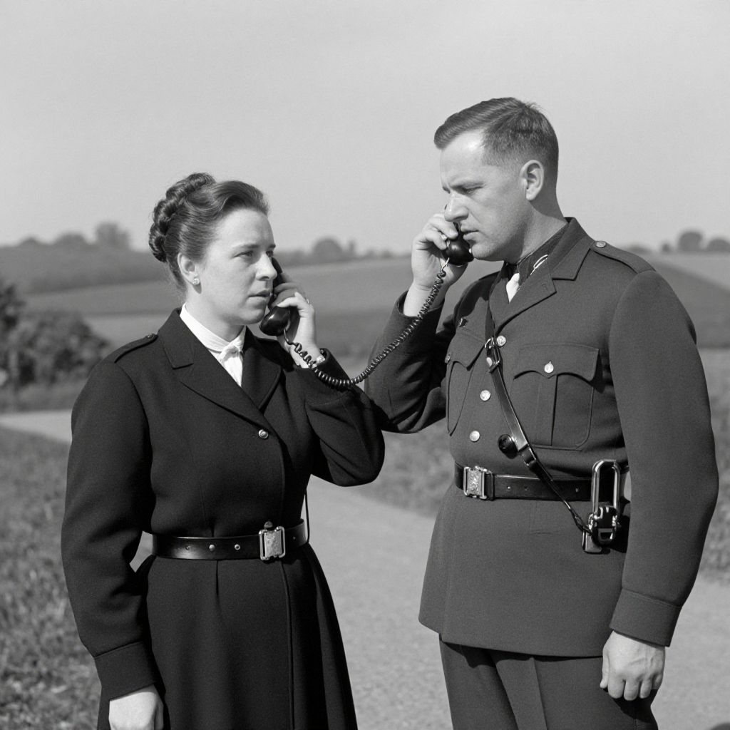 A vintage black-and-white photograph captures Queen Mary's Army Auxiliary Corps Signallers at Base Hill, Rouen, featuring Forewoman Milnes and Captain Pope in formal military attire, with a focus on their roles in telephone communication, set against a backdrop of a rural landscape under dramatic lighting.