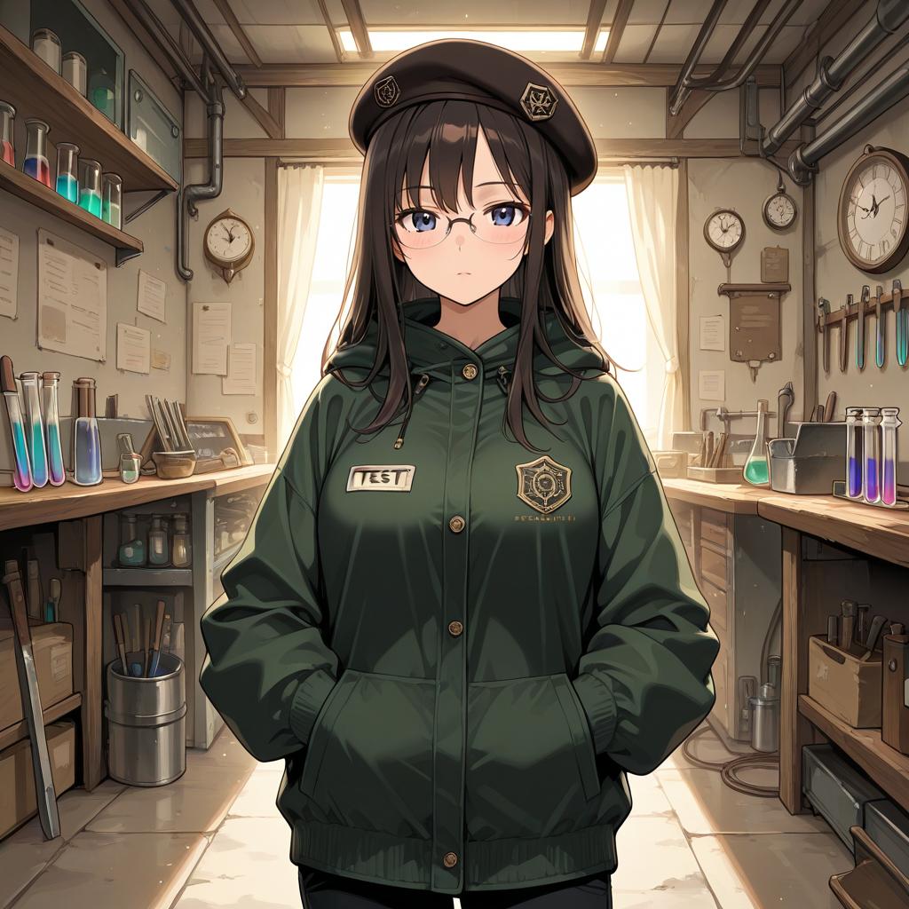 Masterpiece, best quality, looking at viewer, clock, 1girl, beret, long hair, room, test tube, workshop, hands in pockets, glasses
