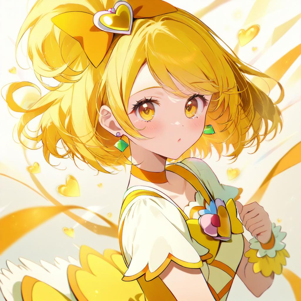 Digital illustration of a magical girl character with short blonde hair styled with a heart-shaped hair ornament and a large yellow bow. The character has bright yellow eyes, wears an orange choker, green earrings, and a detailed yellow and white costume with heart and flower motifs. She has wrist cuffs and a lively background with yellow heart shapes, emitting a warm and vibrant atmosphere. Inspired by anime and magical girl genre.