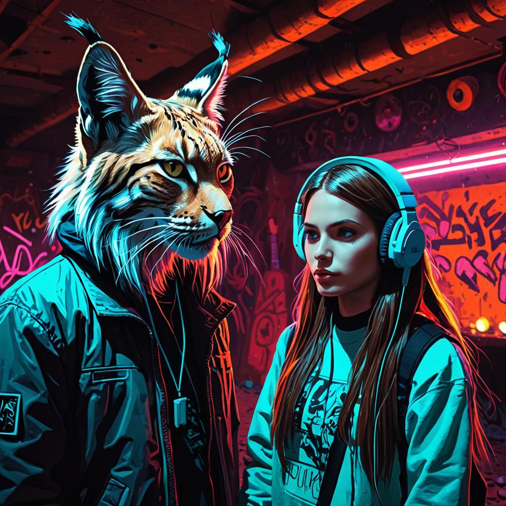 An fox graffiti artist wearing neon‑sound bass‑heavy headphones, autistic bisexual graphic designer with shoulder‑length curly hair, and elegant androgynous humanoid in a bioluminescent jungle nightclub, coherent voidpunk character design rendered by James Jean, vibrant neon palette, cinematic volumetric lighting, trending on DeviantArt.
