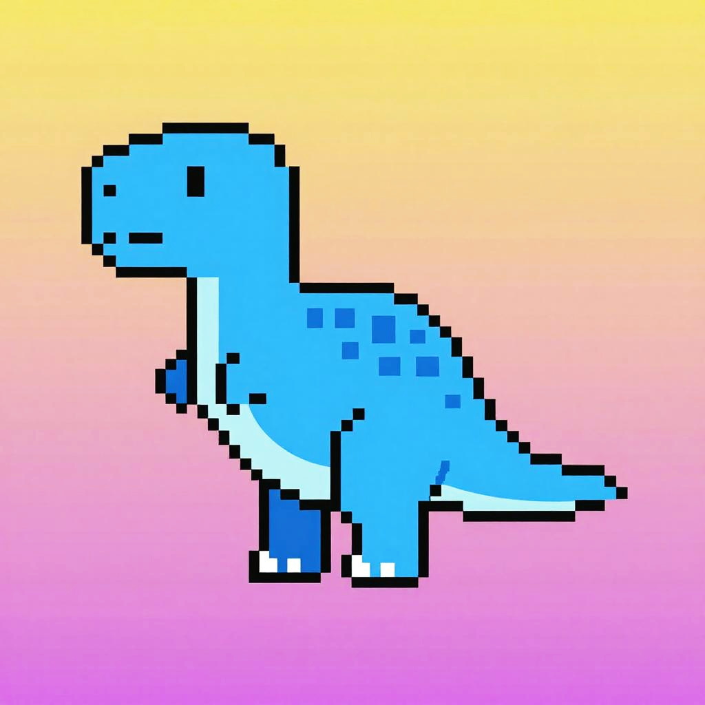 Dinosaur sprite, minimalist pixel art, blue dinosaur with smooth curves and simple features, vibrant neon background, modern pixel art game style, single-frame character portrait for icons or UI