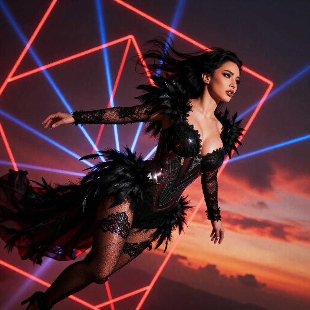 Photograph of a fierce, dark-haired woman in a black, feather-trimmed, corseted outfit with fishnet stockings, striking a dynamic pose. She has pale skin and dramatic makeup, with dark lipstick and smoky eyes. Her outfit is adorned with black feathers and lace, emphasizing her curvy figure and large breasts. She's set against a vibrant backdrop with neon red and blue laser lines forming a geometric pattern against a sunset sky, blending oranges and purples. The image conveys a sense of motion and energy, with the woman appearing mid-leap, surrounded by the dynamic, glowing background.