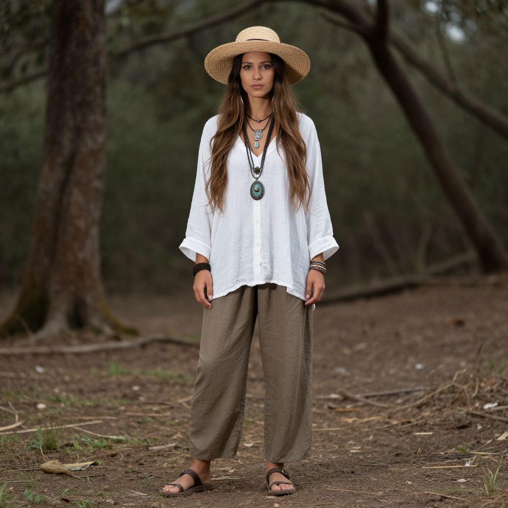 Woman world peace hippie, solo, 1boy, hat, male focus, sandals, long hair, brown hair, standing, full body, jewelry, necklace, shirt, pants, looking at viewer, white shirt, straw hat