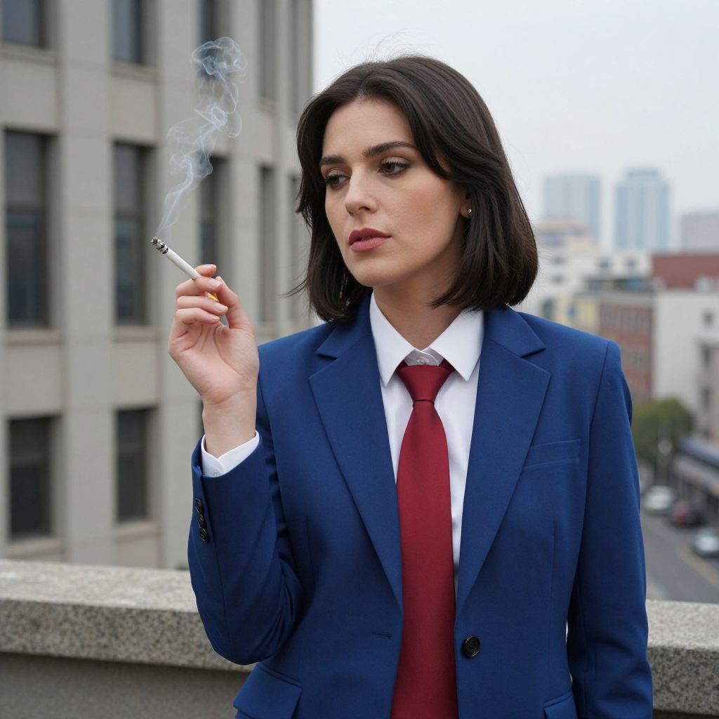 Photograph of a dark-haired woman with fair skin, wearing a blue business suit, white shirt, and red tie, standing on a balcony. She holds a smoking cigarette in her right hand, with a small wisp of smoke rising. The background features tall, grey office buildings and a blurred cityscape. Her expression is serious, with slightly parted lips and dark eye makeup. The image conveys a juxtaposition of professional attire and smoking. The balcony railing is concrete, adding a textured element to the scene. The overall mood is urban and slightly rebellious.