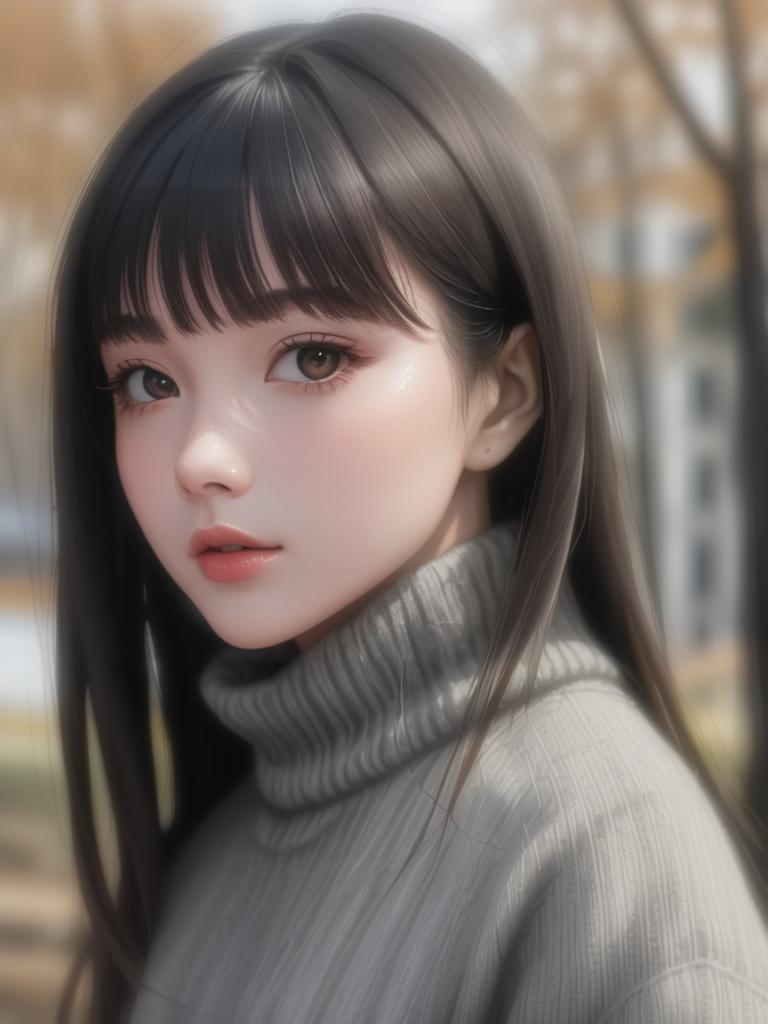 1girl, solo, blurry background, blurry, long hair, sweater, realistic, brown hair, looking at viewer, grey sweater, smile, lips, upper body, brown eyes, outdoors, depth of field, closed mouth, portrait, day, black hair, asian, turtleneck, turtleneck sweater, k-pop, grey shirt