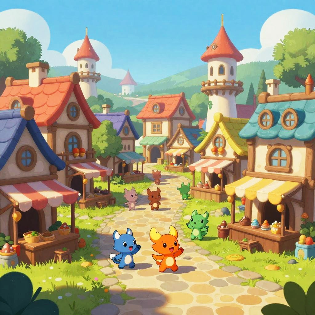 Dofus style fantasy village with whimsical architecture, colorful rooftops, cobblestone streets, lively market scene, cartoonish characters in playful poses, bright and cheerful color palette, sunny day with clear skies, fantasy role-playing game atmosphere