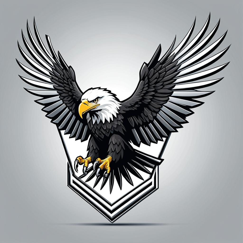 Digital illustration of a bald eagle logo with outstretched wings in a majestic pose. The design features sharp angular lines with a metallic silver color palette, conveying a futuristic and dynamic look. The eagle's head is white with a yellow beak and fierce eyes, while the wings and body are depicted in shades of black and silver. The logo is set against a gradient gray background.