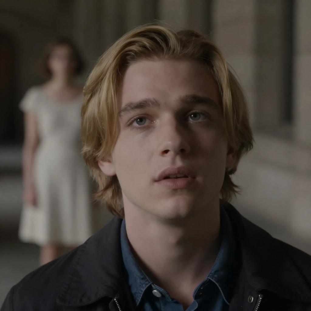 Young man with curly blonde hair in a white military-style jacket with silver buttons, clasping hands, serious expression. Background: blurred people, one with a white feathered hat, dimly lit room. Warm lighting.