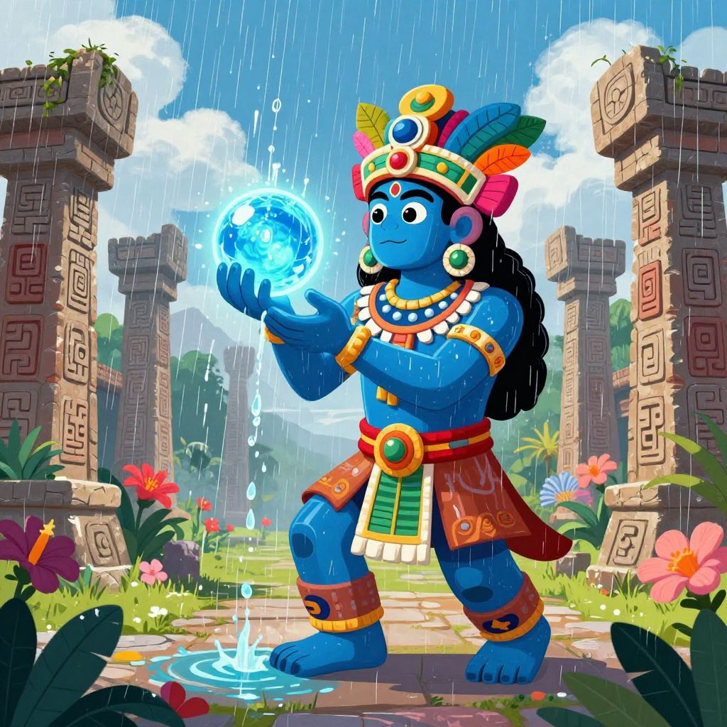 A vibrant digital illustration of Tlaloc, the Aztec god of rain and fertility, depicted as a blue-skinned figure adorned with colorful traditional headgear and jewelry. Tlaloc is holding a glowing orb with water flowing from it, symbolizing rain. The scene is set in a mystical ancient temple complex with stone pillars decorated with Aztec motifs, surrounded by blooming tropical flowers under a bright, cloudy sky.